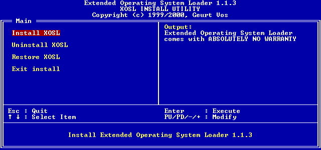 Choose to install XOSL. The next sections of this document provide a detailed description on the installation of XOSL.