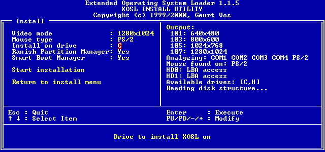 Here you will have to choose on what DOS drive XOSL is to be installed. Install will copy several files to the root directory of the selected drive, so which one you choose merely depends on where it is the least inconvenient