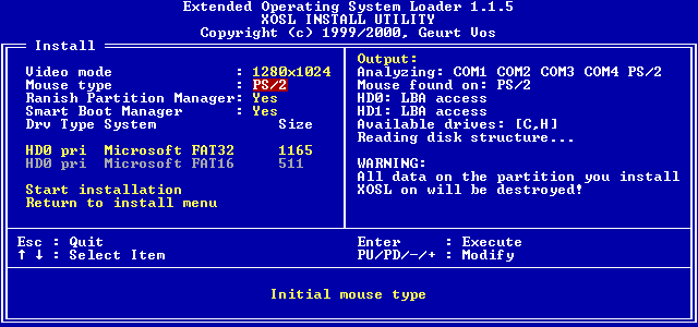 Next you will have to select the mouse to use for XOSL. Usually only one mouse is connected to the system. Install will have it selected, and you will not have to change anything. If more than one mouse are connected, use Page Up or Page Down to select the right one. If you don't want to use a mouse at all, select None. Selecting none will shorten the time needed to initialize XOSL. However, mouse usage is strongly recommended, because it greatly simplifies controlling XOSL.