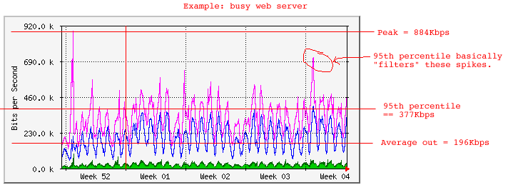 The 95th percentile is the smallest number that is greater that 95% of the numbers in a given set. The reason this statistic is so useful in measuring data throughput is that is gives a very accurate picture of the cost of the bandwidth. Here's an example. Suppose an ISP sells you a T1 line, but you're only using it to access the web. Even though you might frequently download very large files (filling the pipe) your cost to the ISP is negligible, because your usage is intermittent. A single T3 connection to the backbone could easily support hundreds of such downstream customers, and never become saturated. As another example, suppose you are hosting a very busy web site that half-way fills your T1 for several hours every day. This type of bandwidth is more expensive, because your ISP can't oversell their connection to the backbone as effectively. The important thing to realize is that it doesn't cost your ISP anything to sell you a pipe of any particular size - it is the sustained rate of data transfer that costs them money. The sum of the 95th percentile usage of all of an ISP's customers predicts the peak amount of backbone traffic that the ISP will incur (in a given direction).