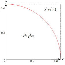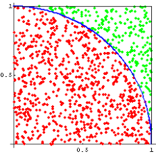 naključnih (random) točk na kvdratu in četrtini kroga (površina kvadrata S = 1x1 je sor. s št. vseh N točk, in
