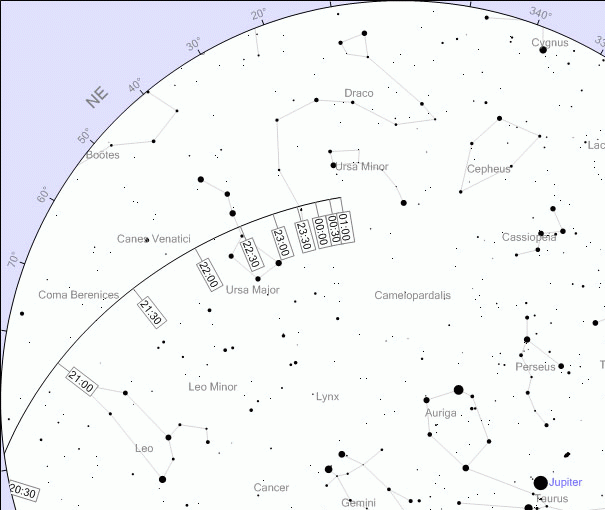 021520302013:15-02-2013 21:30:00 Alt = 19° 33' Az = 90° 37' (E) 021521002013:15-02-2013 22:00:00 Alt = 36° 31' Az = 77° 54' (E) 021521302013:15-02-2013 22:30:00 Alt = 47° 33' Az = 64° 26' (ENE) 021522002013:15-02-2013 23:00:00 Alt = 53° 45' Az = 51° 06' (NE) 021522302013:15-02-2013 23:30:00 Alt = 56° 45' Az = 39° 03' (NE) 021523002013:16-02-2013 00:00:00 Alt = 57° 29' Az = 29° 15' (NNE) 021523302013:16-02-2013 00:30:00 Alt = 57° 35' Az = 21° 26' (NNE) 021600002013:16-02-2013 01:00:00 Alt = 57° 06' Az = 15° 27' (NNE) 021600302013:16-02-2013 01:30:00 Alt = 56° 20' Az = 10° 55' (N) 021601002013:16-02-2013 02:00:00 Alt = 55° 28' Az = 7° 30' (N) 021601302013:16-02-2013 02:30:00 Alt = 54° 34' Az = 4° 58' (N) 021602002013:16-02-2013 03:00:00 Alt = 53° 41' Az = 3° 04' (N) 021602302013:16-02-2013 03:30:00 Alt = 52° 53' Az = 1° 39' (N) 021603002013:16-02-2013 04:00:00 Alt = 52° 09' Az = 0° 37' (N) 021603302013:16-02-2013 04:30:00 Alt = 51° 29' Az = 359° 51' (N) 021604002013:16-02-2013 05:00:00 Alt = 50° 55' Az = 359° 18' (N) 021604302013:16-02-2013 05:30:00 Alt = 50° 26' Az = 358° 54' (N)