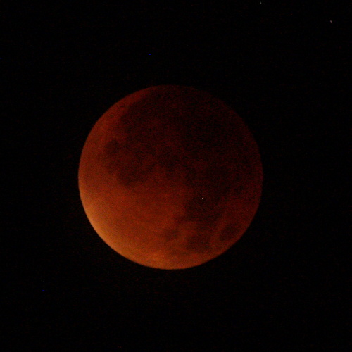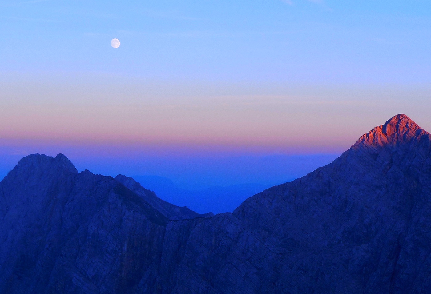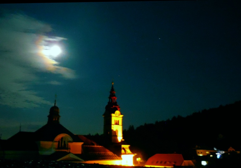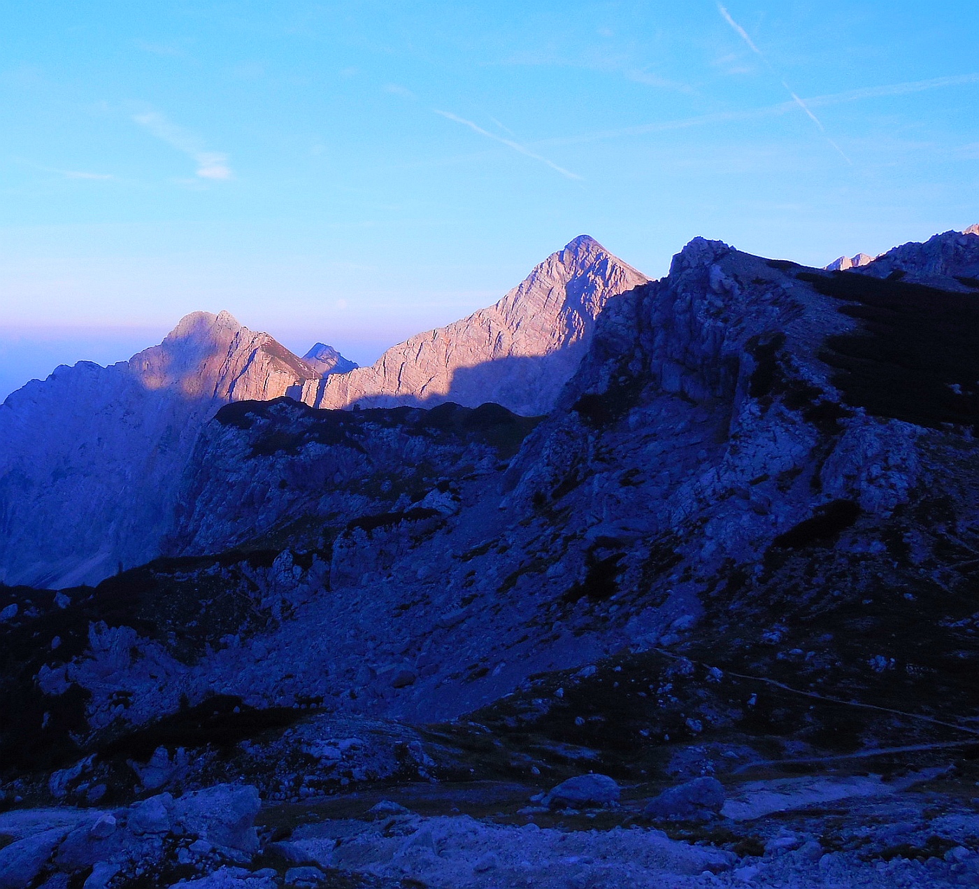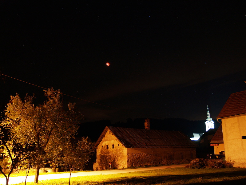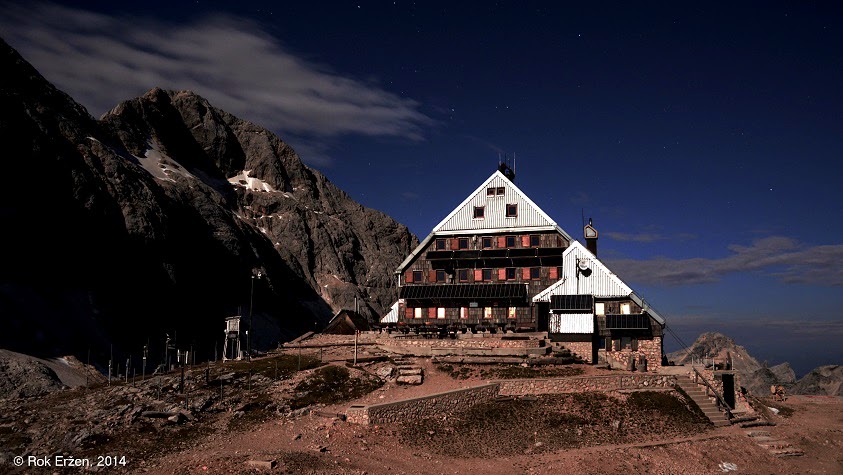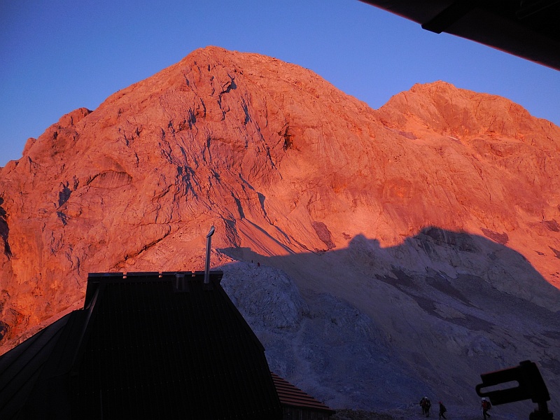 Pogled iz koče na Triglav ob vzidu sonca - tudi Luna je op popolnem mrku rdeče barve iz enakih razlogov kot Triglav - atmosfera namreč najmanj sipa prav rdečo barvo, ki tako ob vzidu sonca uspe prodreti čez atmosfero. Bo treba vstati, se na pot podati.