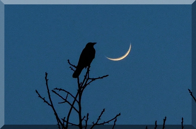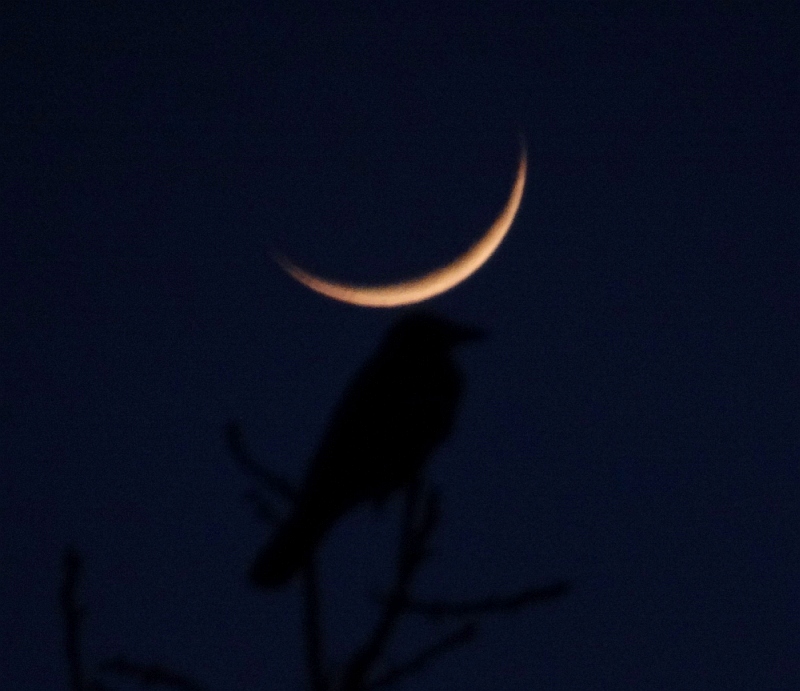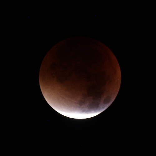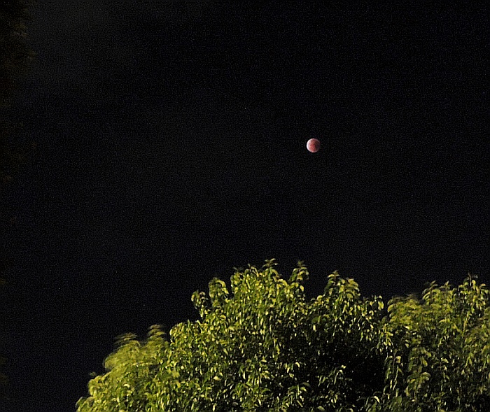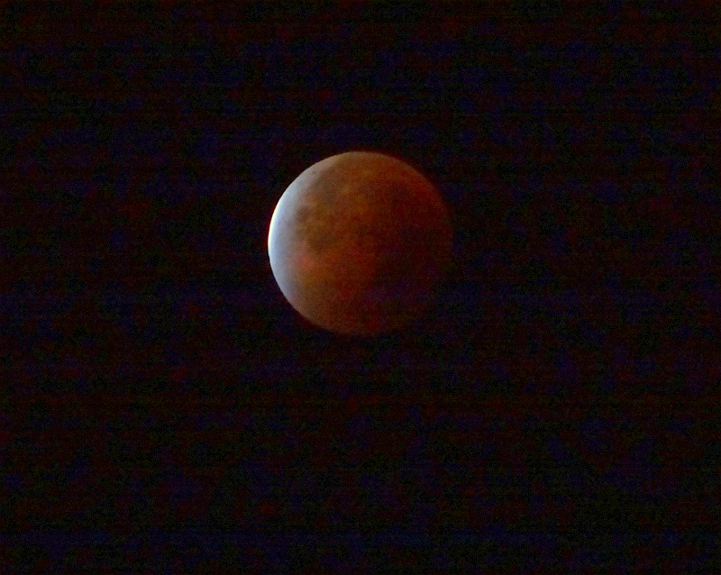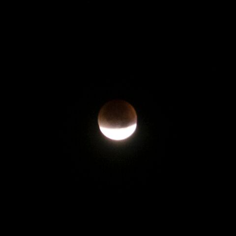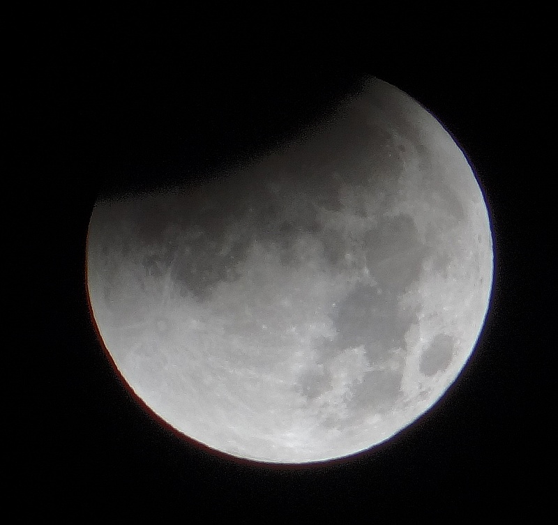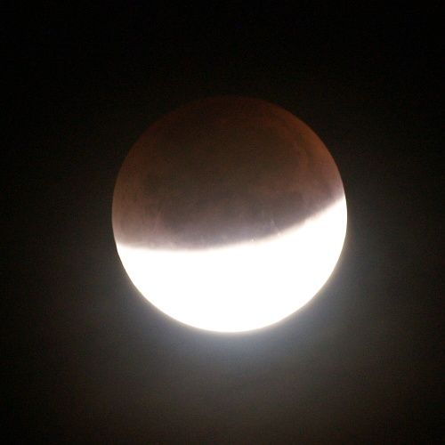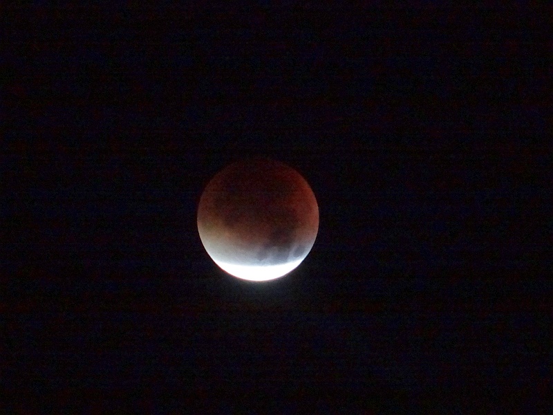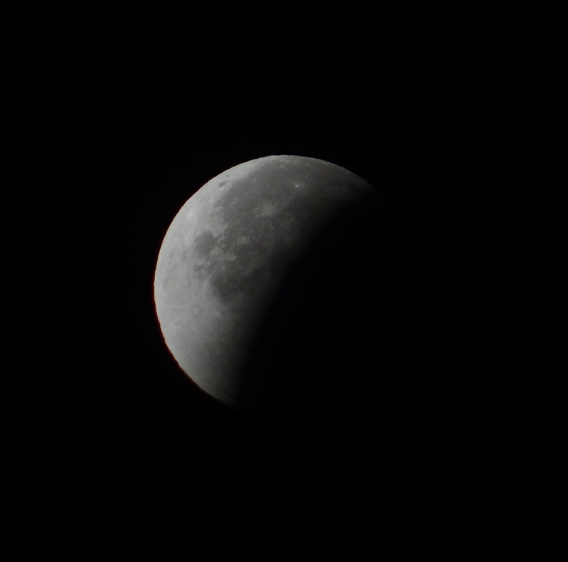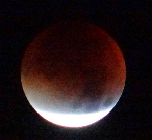 Pogled iz koče na Triglav ob vzidu sonca - tudi Luna je op popolnem mrku rdeče barve iz enakih razlogov kot Triglav - atmosfera namreč najmanj sipa prav rdečo barvo, ki tako ob vzidu sonca uspe prodreti čez atmosfero. Bo treba vstati, se na pot podati.