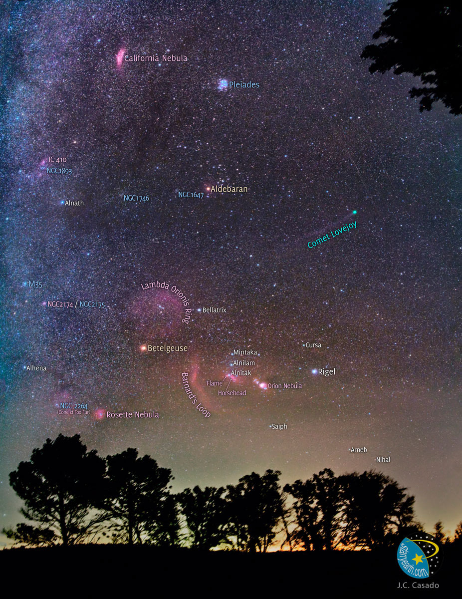 Pojasnilo: Komet Lovejoy je postal viden s prostim očesom. Za ogled kometa pojdite na prosto kako uro po sončnem zahodu in poiščite megličast objekt desno od Orionovega pasu. Pomagate si lahko z binokularji in zvezdnimi kartami. Na tej sliki je komet C/2014 Q2 (Lovejoy) posnet pred tremi dnevi, ko je šel skoraj natanko pred M79, kroglasto zvezdno kopico, vidno kot svetlo piko malo nad in levo od kometove zeleno obarvane kome. Jedro kometa Lovejoy je velikanska umazana ledena gora, ki ob približevanju Soncu spušča plin v dolg in zamotan ionski rep, ki se razteza čez sliko. Pričakujejo, da bo komet v januarju postal opazovalcem iz severne poloble še lažje viden, saj bo vzhajal vedno prej in bo po pričakovanjih vedno svetlejši.