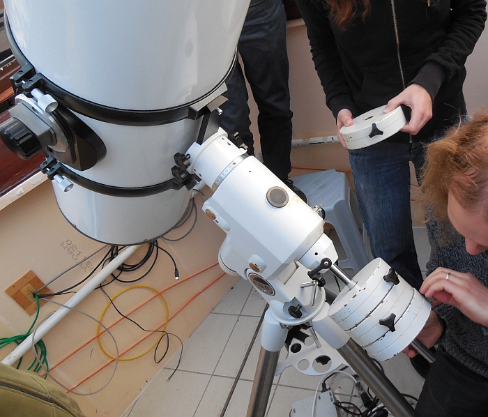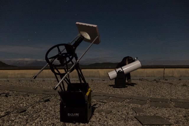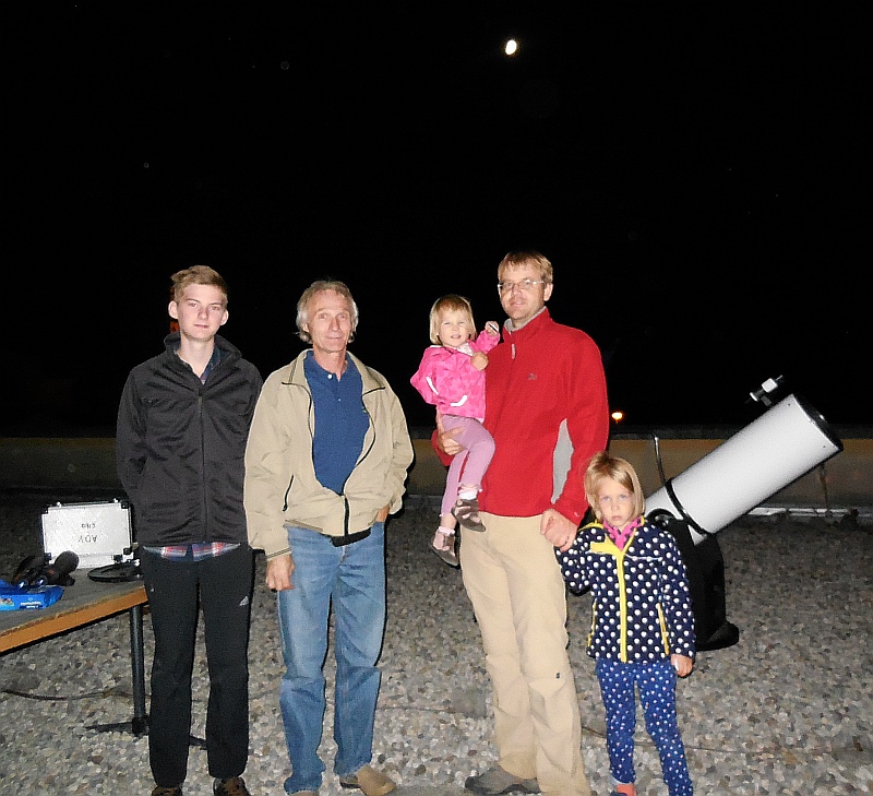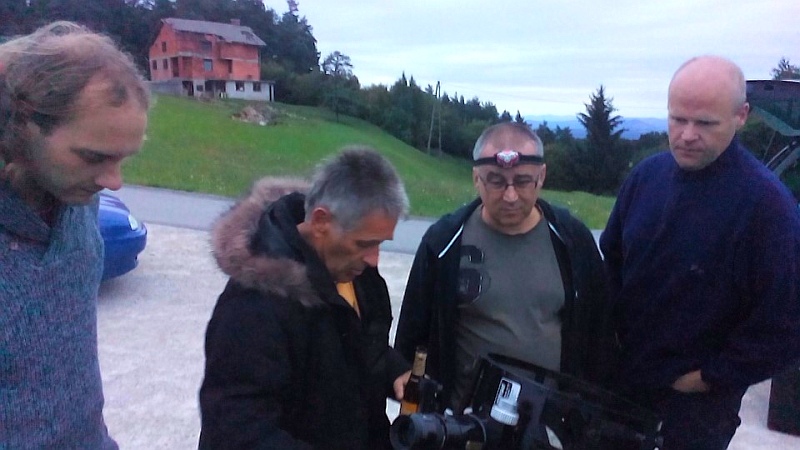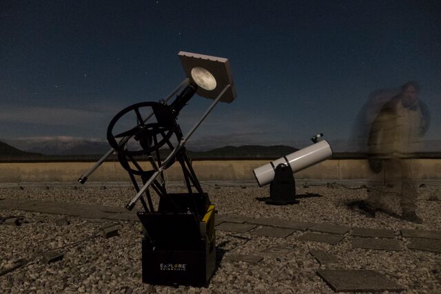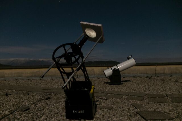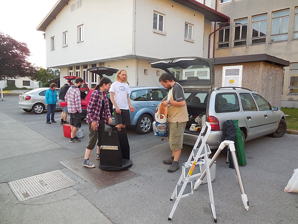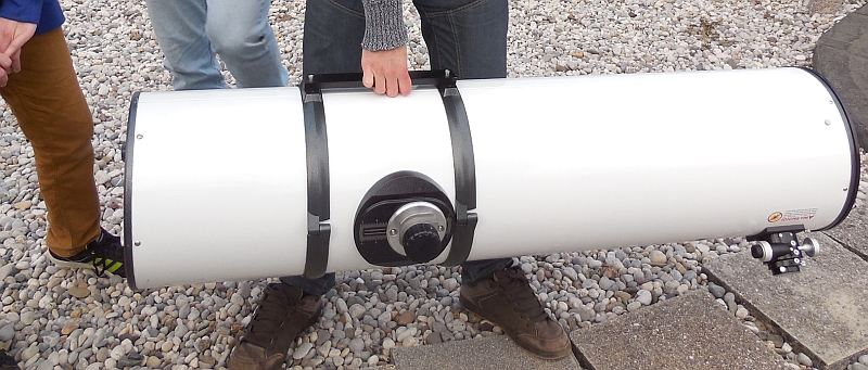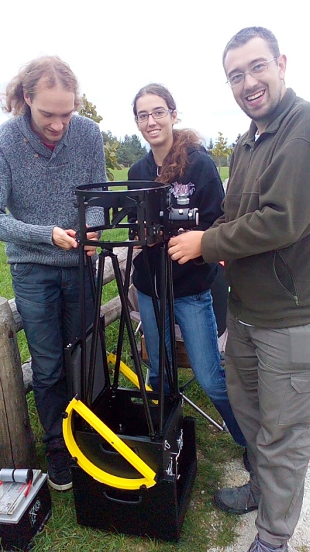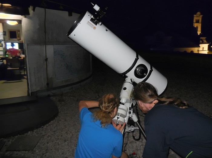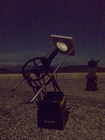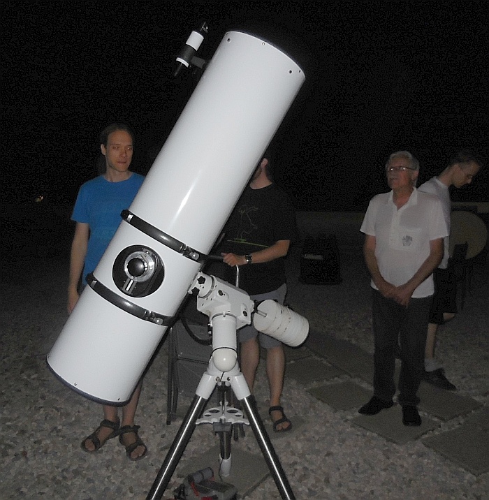 AD Vega člani (Andrej, Ida, Klemen, Gaja) testirajo novo pridobitev, našo donacijo za slovensko astronomijo, ki je namenjena za opazovanja nad 2515 m nad morjem - teleskop Explore Scientific Ultra Light Dobson, premera 254 mm, 1270 mm gorišča, f/5 .