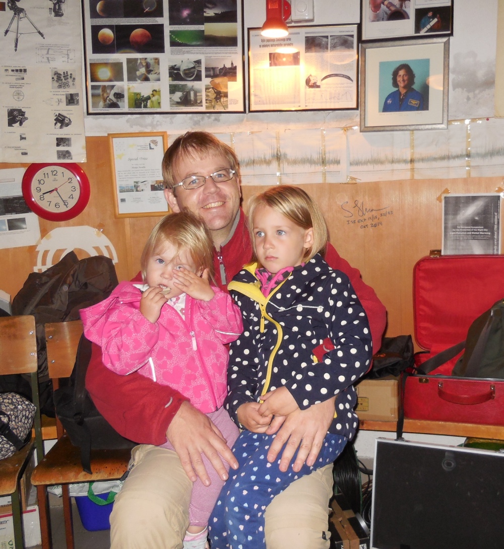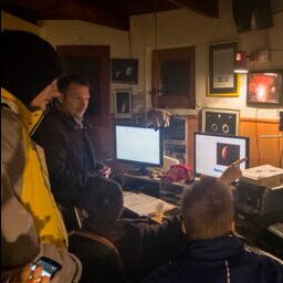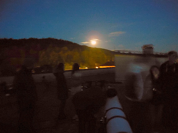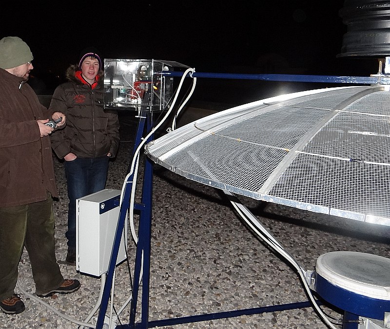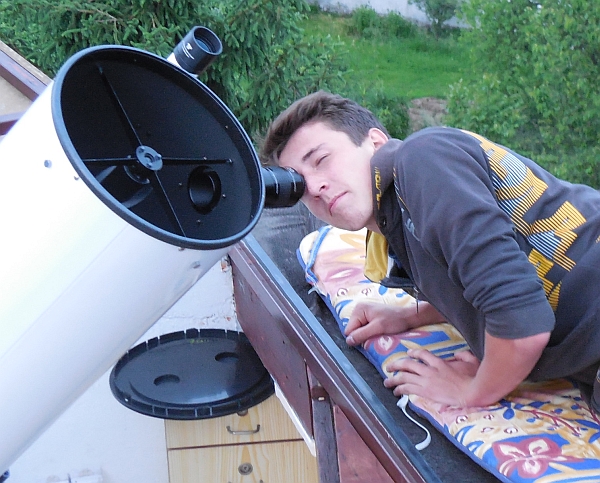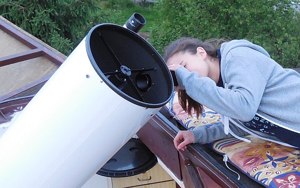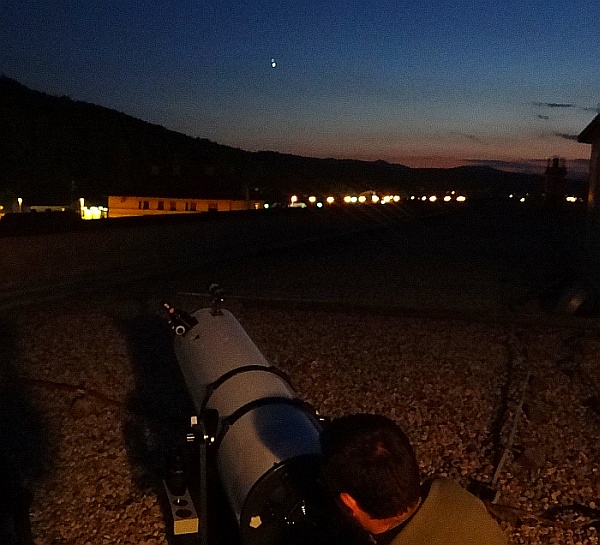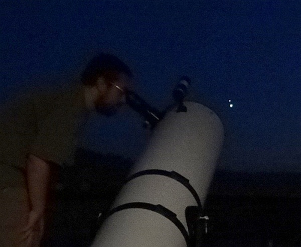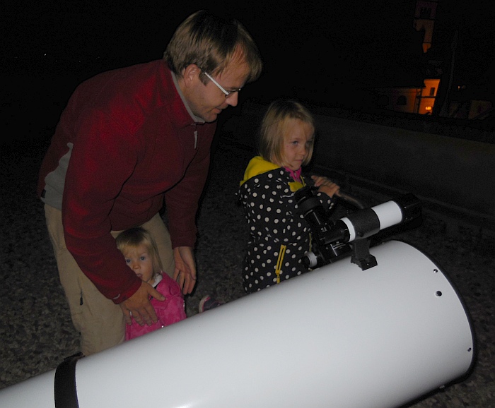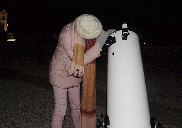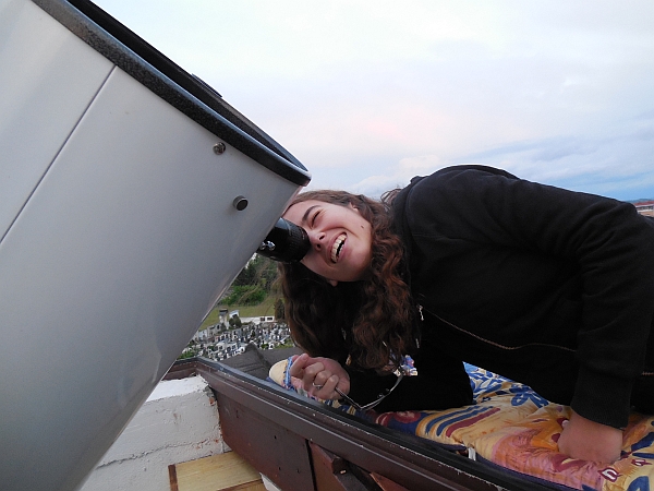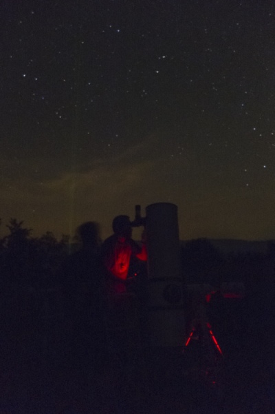 AD Vega člani (Andrej, Ida, Klemen, Gaja) testirajo novo pridobitev, našo donacijo za slovensko astronomijo, ki je namenjena za opazovanja nad 2515 m nad morjem - teleskop Explore Scientific Ultra Light Dobson, premera 254 mm, 1270 mm gorišča, f/5 .