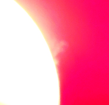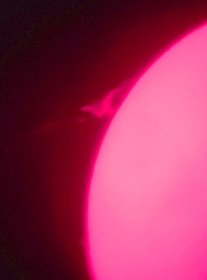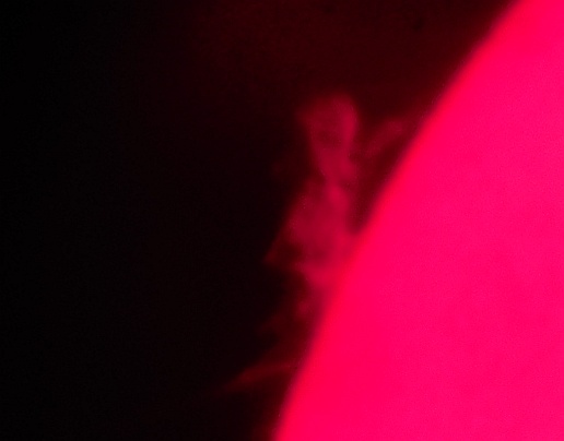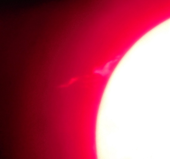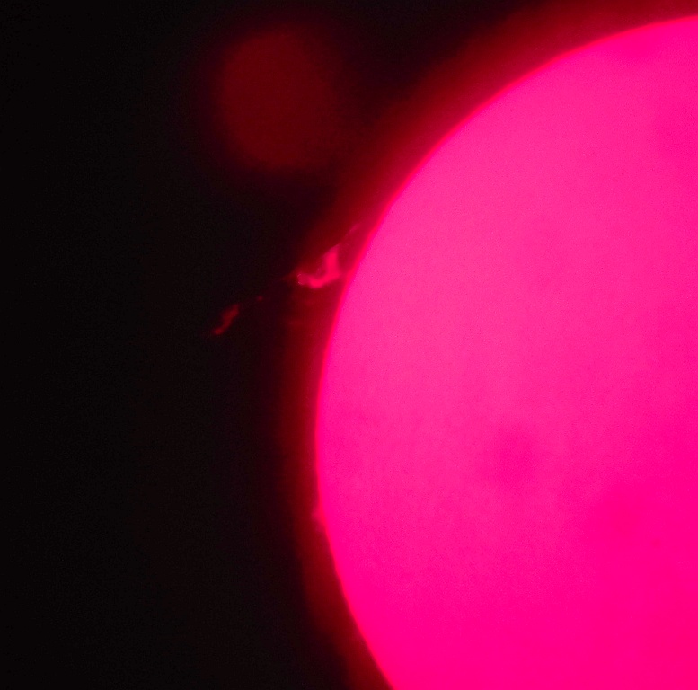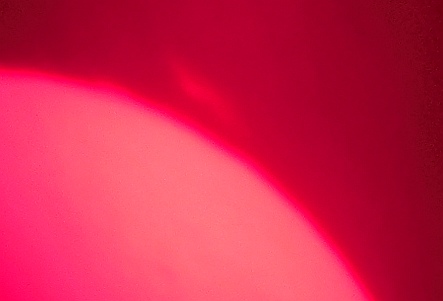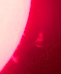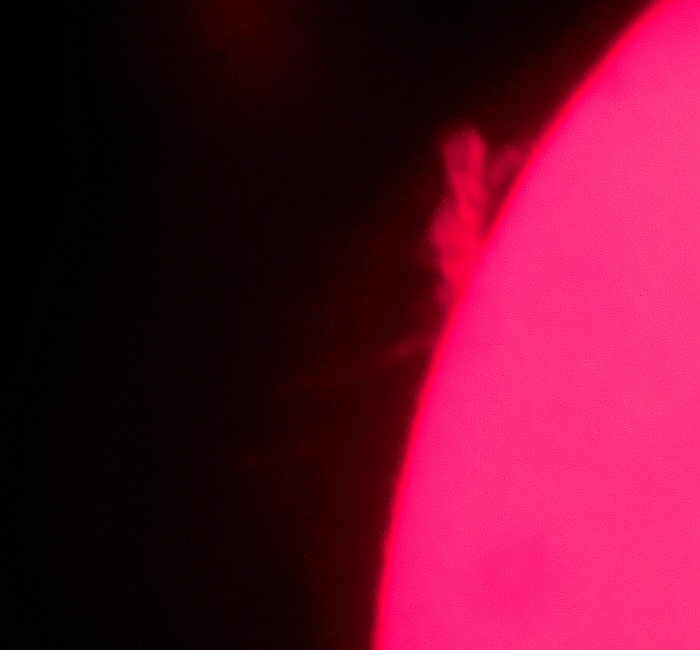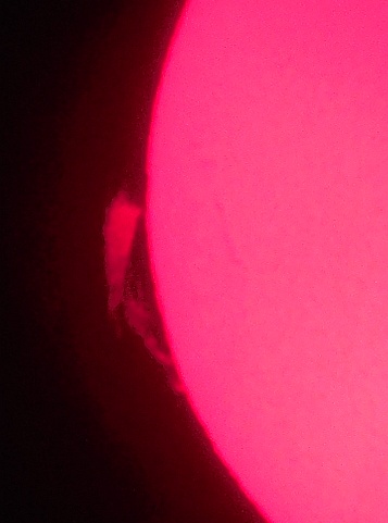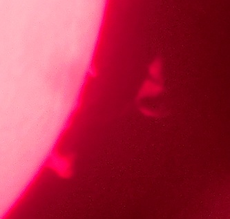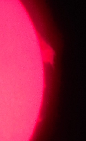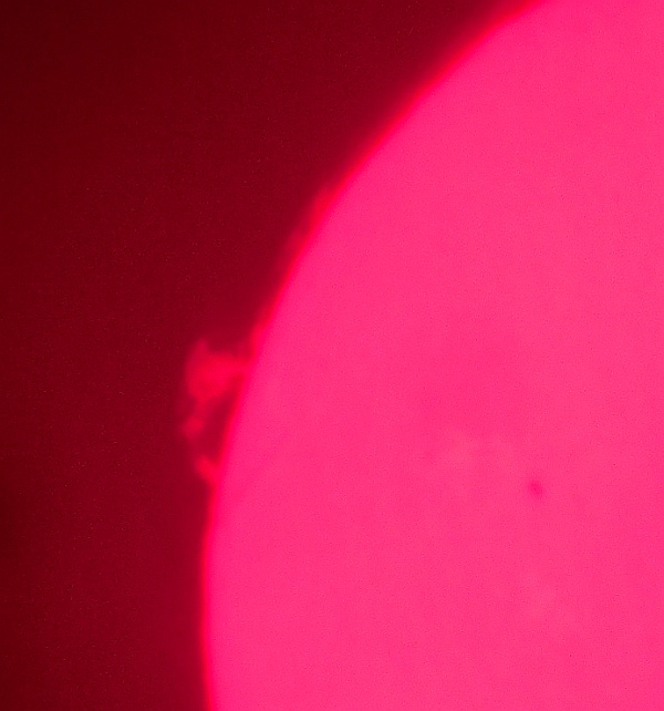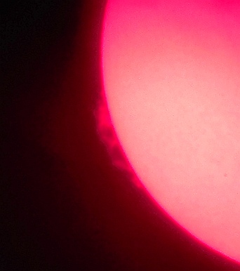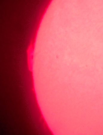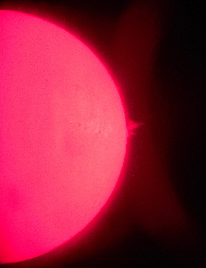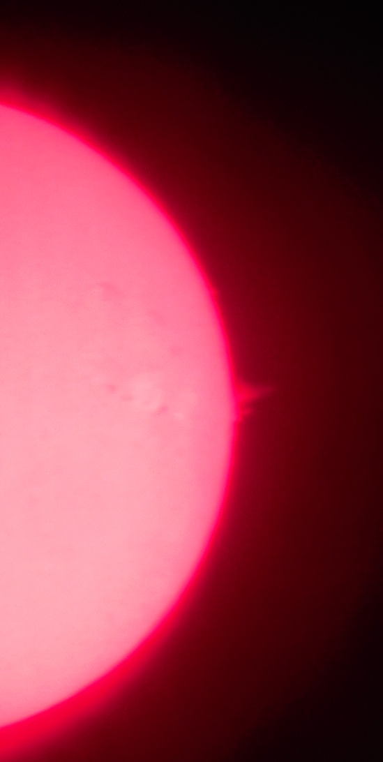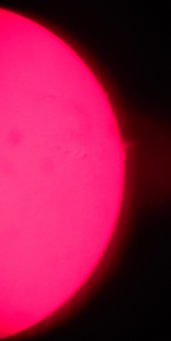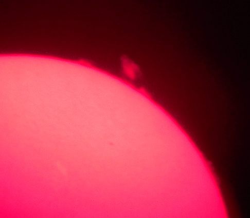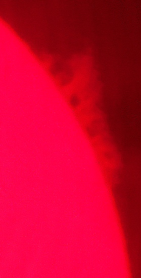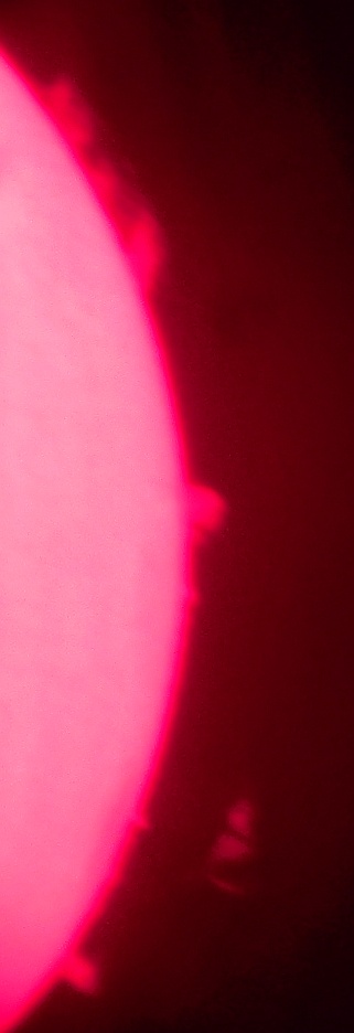 Za pokušino nekaj slik izjemne protuberance na robu Sonca - 17. sep. 2015. Posneto s H-alfa teleskopom Lunt 35 mm, zgolj z žepnim nizkocenovnim kompaktnim digitalnim fotoaparatom Nikon COOLPIX S6400 skozi okular.