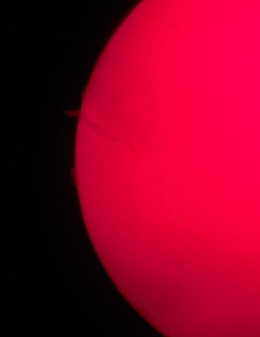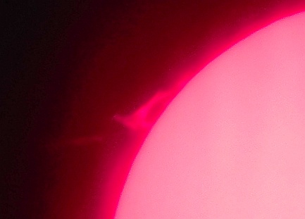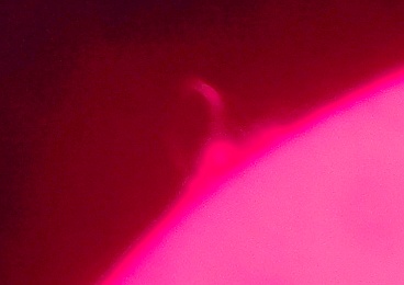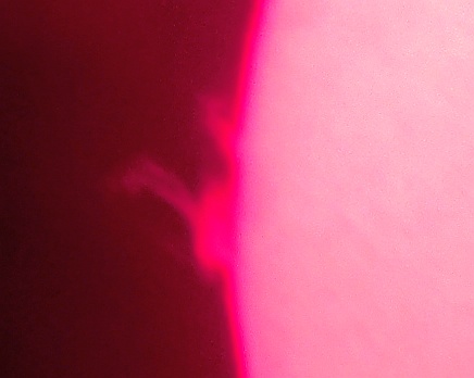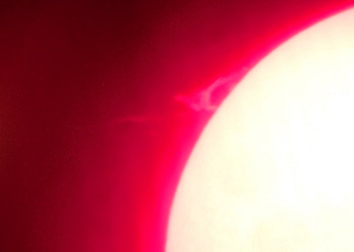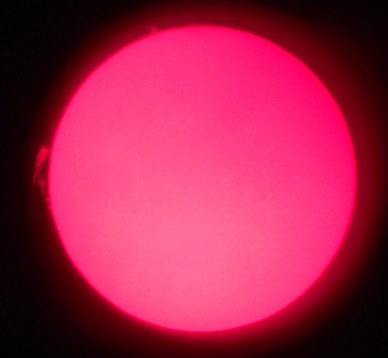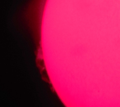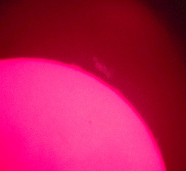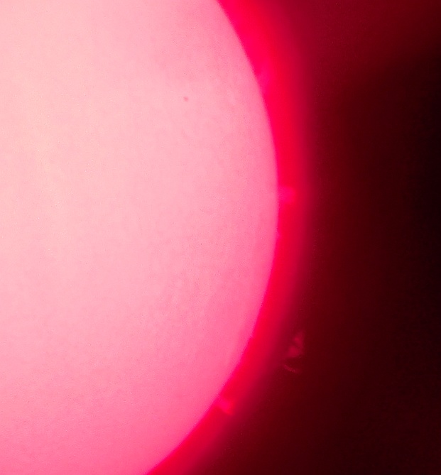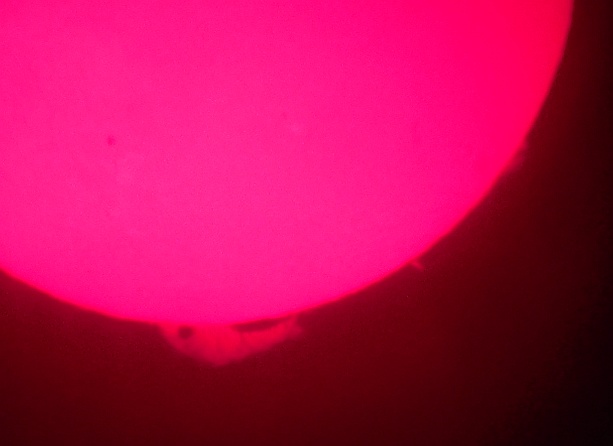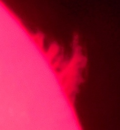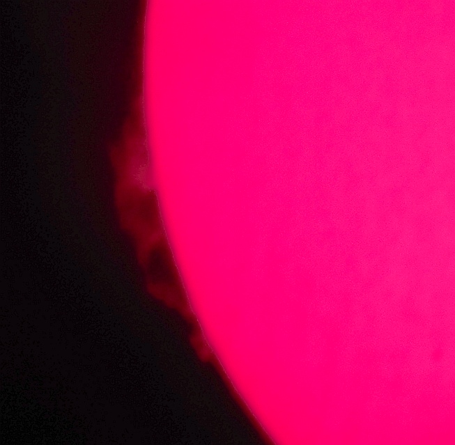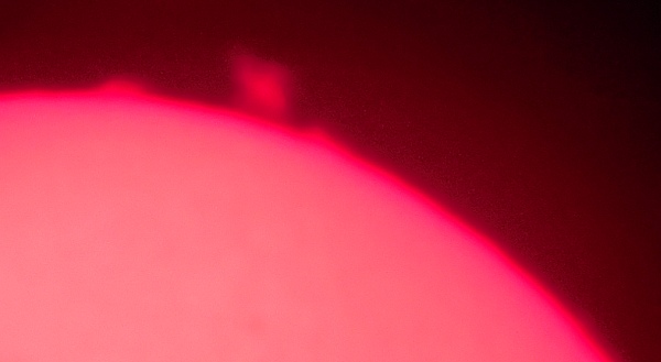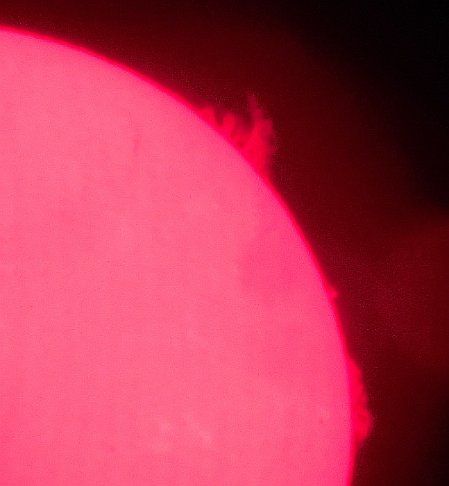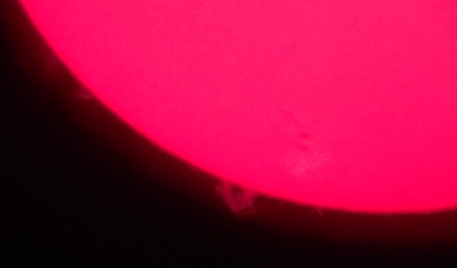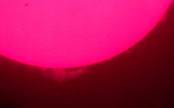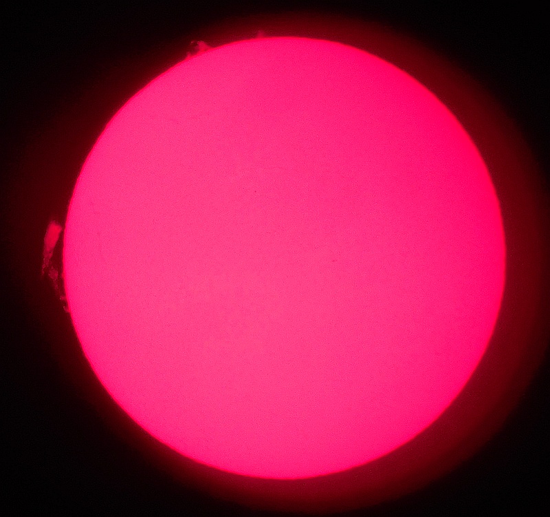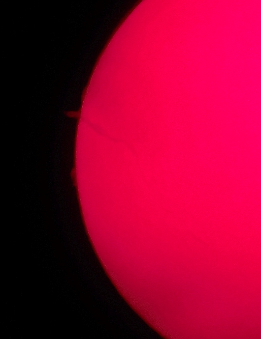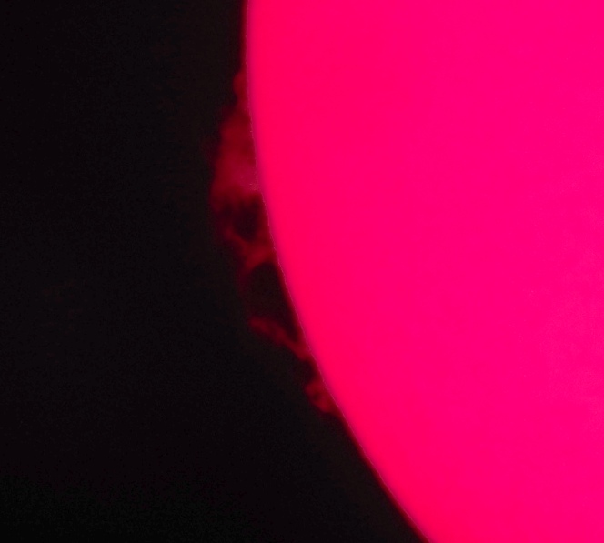 Za pokušino nekaj slik izjemne protuberance na robu Sonca - 17. sep. 2015. Posneto s H-alfa teleskopom Lunt 35 mm, zgolj z žepnim nizkocenovnim kompaktnim digitalnim fotoaparatom Nikon COOLPIX S6400 skozi okular.