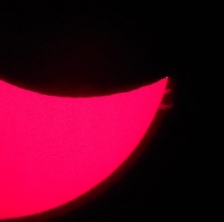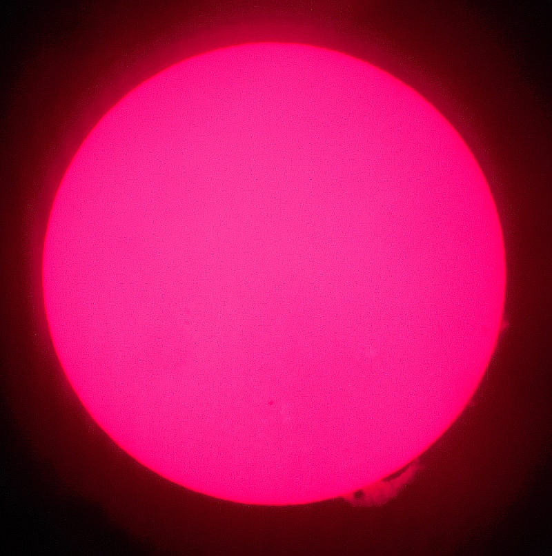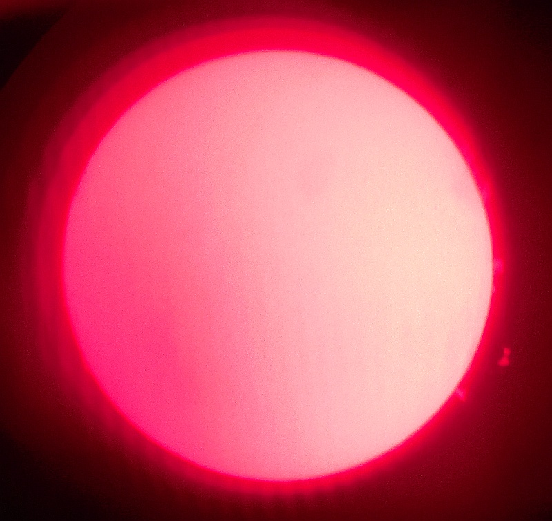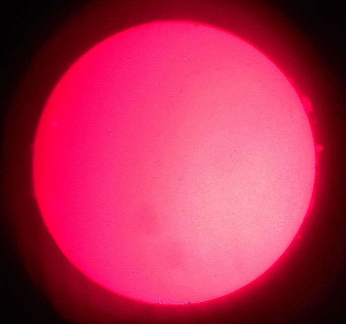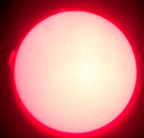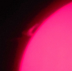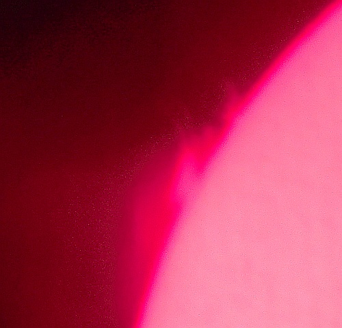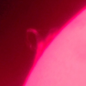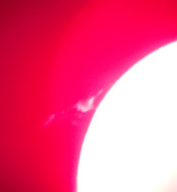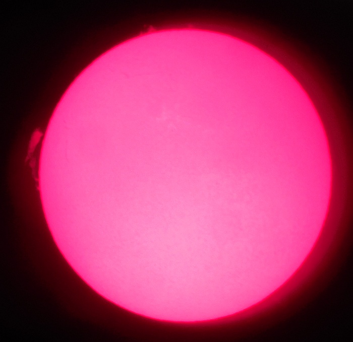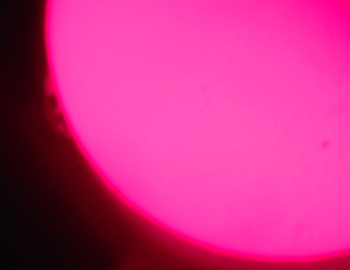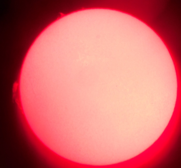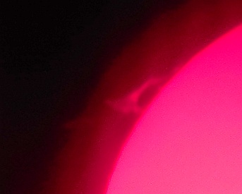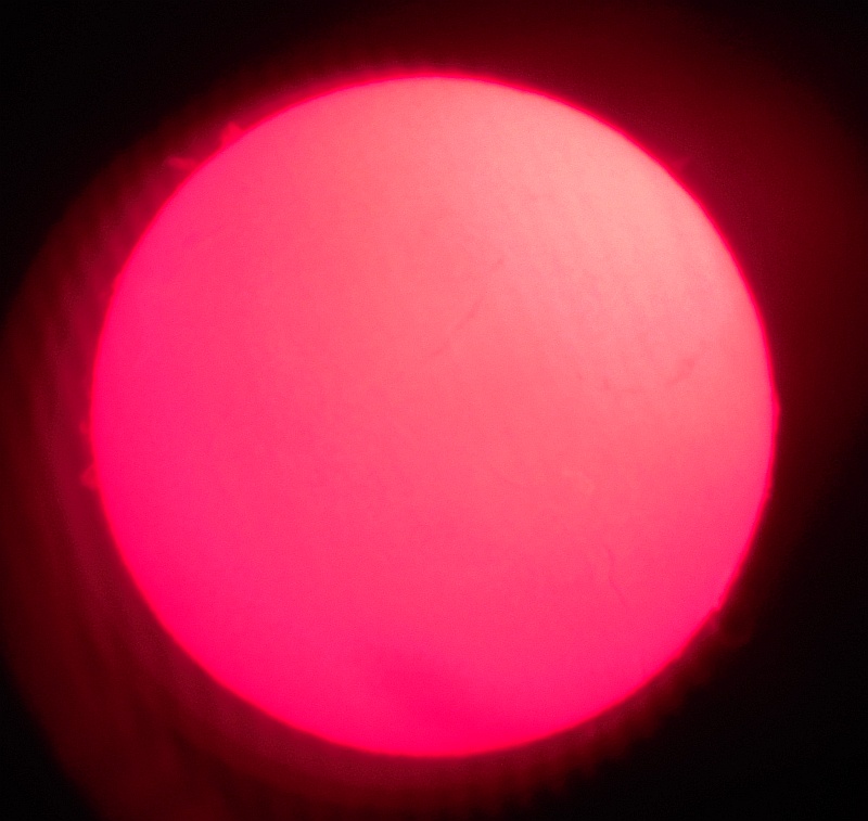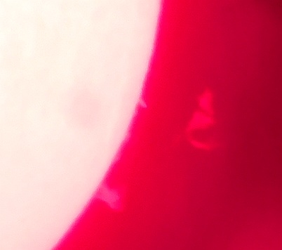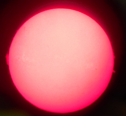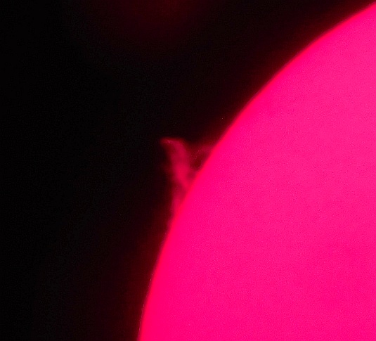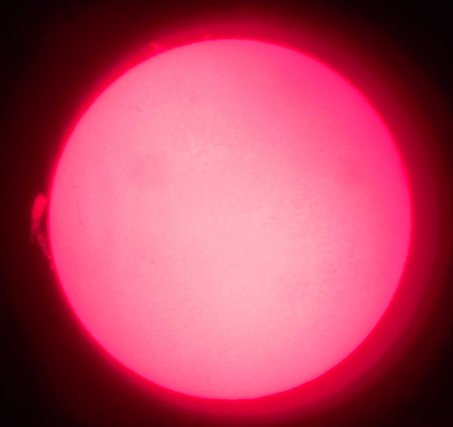 Za pokušino nekaj slik izjemne protuberance na robu Sonca - 17. sep. 2015. Posneto s H-alfa teleskopom Lunt 35 mm, zgolj z žepnim nizkocenovnim kompaktnim digitalnim fotoaparatom Nikon COOLPIX S6400 skozi okular.