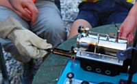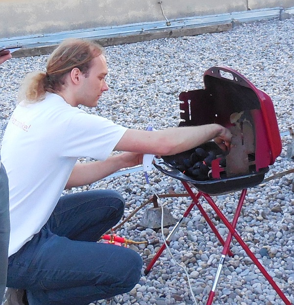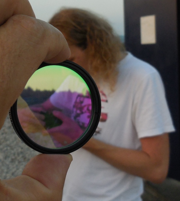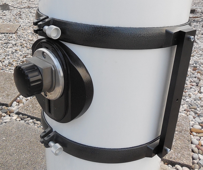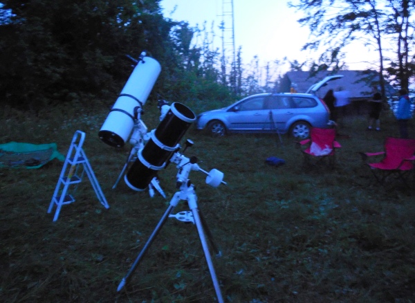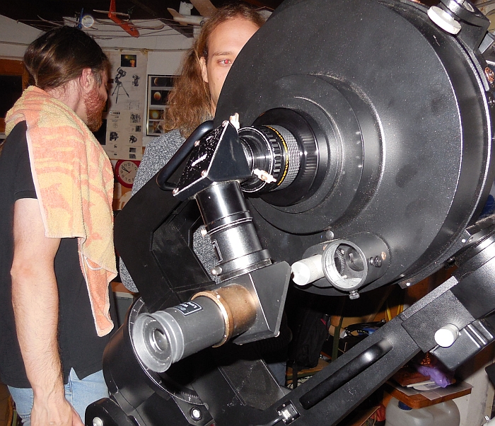 Andrej je torej zadevo vzel v svoje roke in je s pilo dodobra obdelal odprtino za fokuser (naredil jo je nekoliko ovalno - hrup obdelave je bil podoben tistemu iz kakšne kovačnice), prestavil - zasukal je tudi samo lego fokuserja na obroču (za enostavnejše položaje med opazovanji), vijake trdno privil, kolimiral teleskop (zanimivo, s kolimirno palico za primarno zrcalo) in sedaj je teleskop bil že do te mere popravljen, da je uspešno preživel prva testiranja. Po prvih razočaranjih zaradi šlampaste montaže in tovarniških finalnih del, smo pa, po prvih pogledih v nebo, lažje zadihali. Epsilon Lire se je krasno razločila že pri povečavi 91x, pri povečavi 141 pa brez težav - nobenih repkov, žarkov, tema med pari zvezd. Na hitro smo popotovali po jesenskem nebu (Hi-h je bila pri povečavi 63 krasna, M31 izjemno svetla, M57, M27, M11, M38 ...). Ko smo pokukali proti jugu, zagledamo Južno ribo (Fomalhaut je bil izjemno svetele), ali ujamemo Heliksa - pa dajmo (povečava 42x,izstopna zenica 5.9 mm in seveda UHC filter). In Klemenu je uspelo - prvič zares smo ujeli NGC7293, planetarno meglico Heliks iz Ljubljane - v obeh teleskopih, tudi v Ciki.