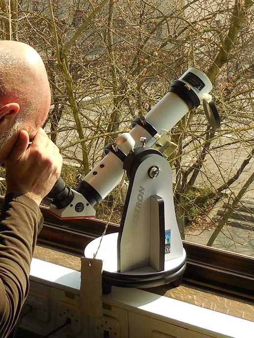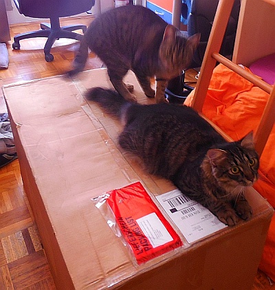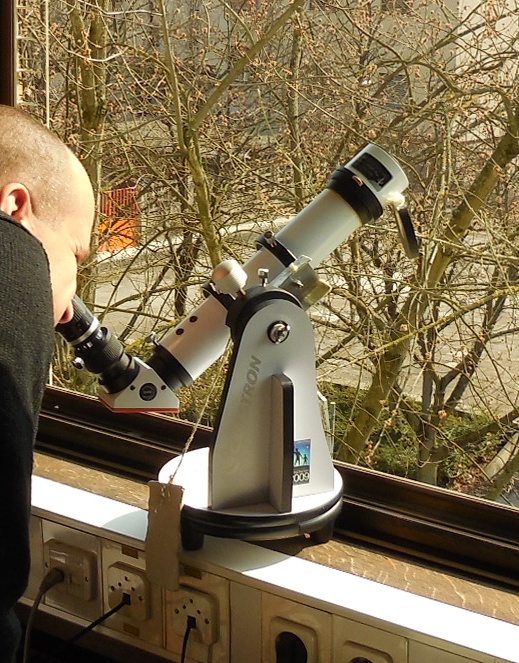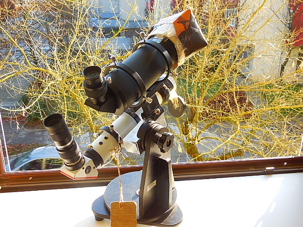 V ta namen smo že naročili teleskop Explore Scientific Ultra Light Dobson, premera 254 mm, 1270 mm gorišča, f/5 in tri okularje. Prejeli smo ga 18. sep. - sliki spodaj - sedaj ga moramo še testirati in "obleči" ... Še malo simbolike - ko smo prejeli paket, sta domača radovedna mucka brž skočila na nov teleskop in začela "opazovati" okolico ...