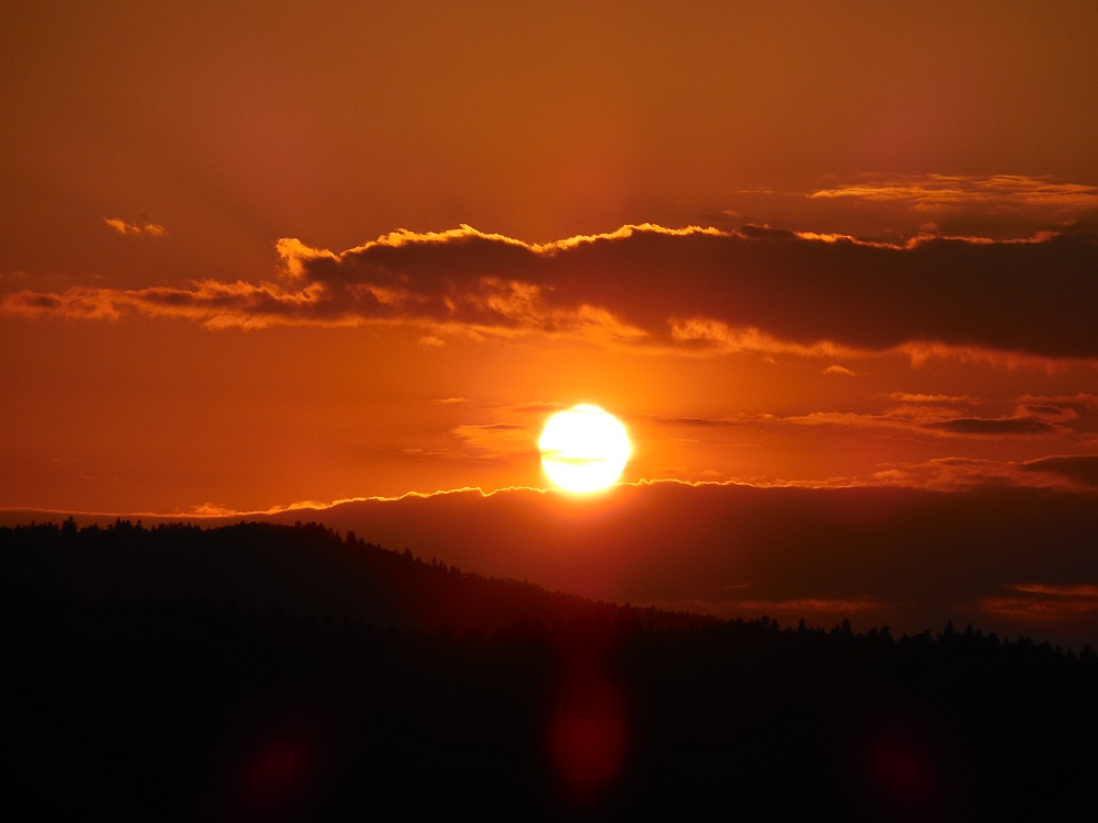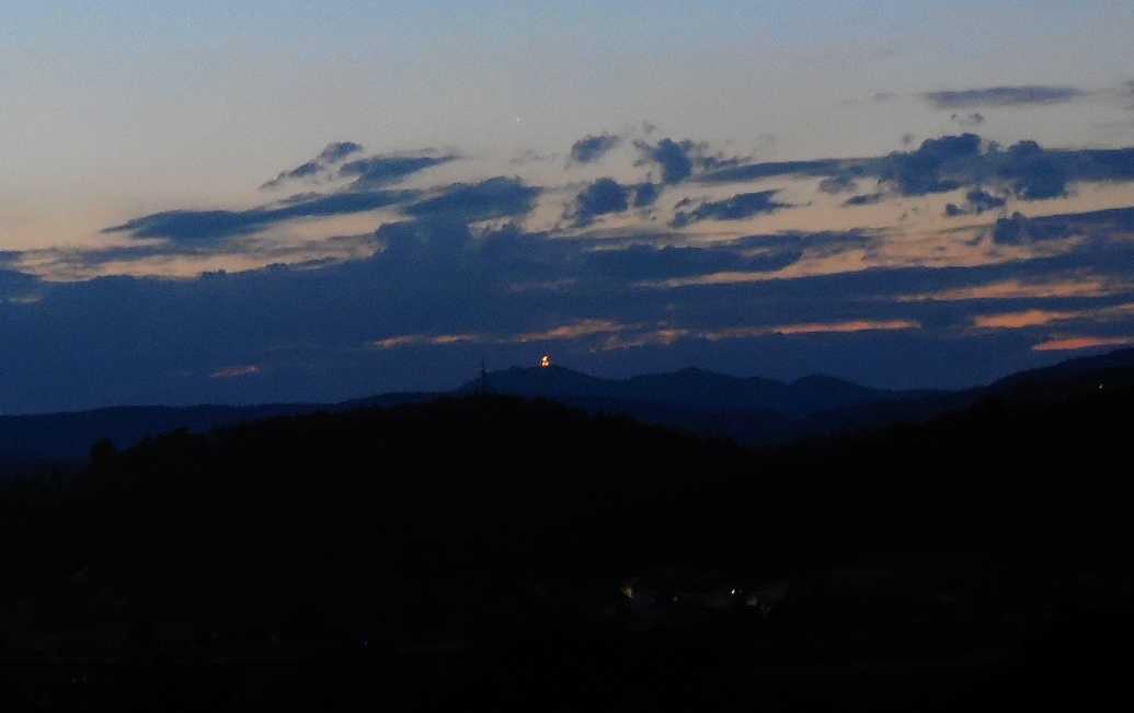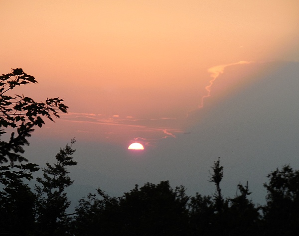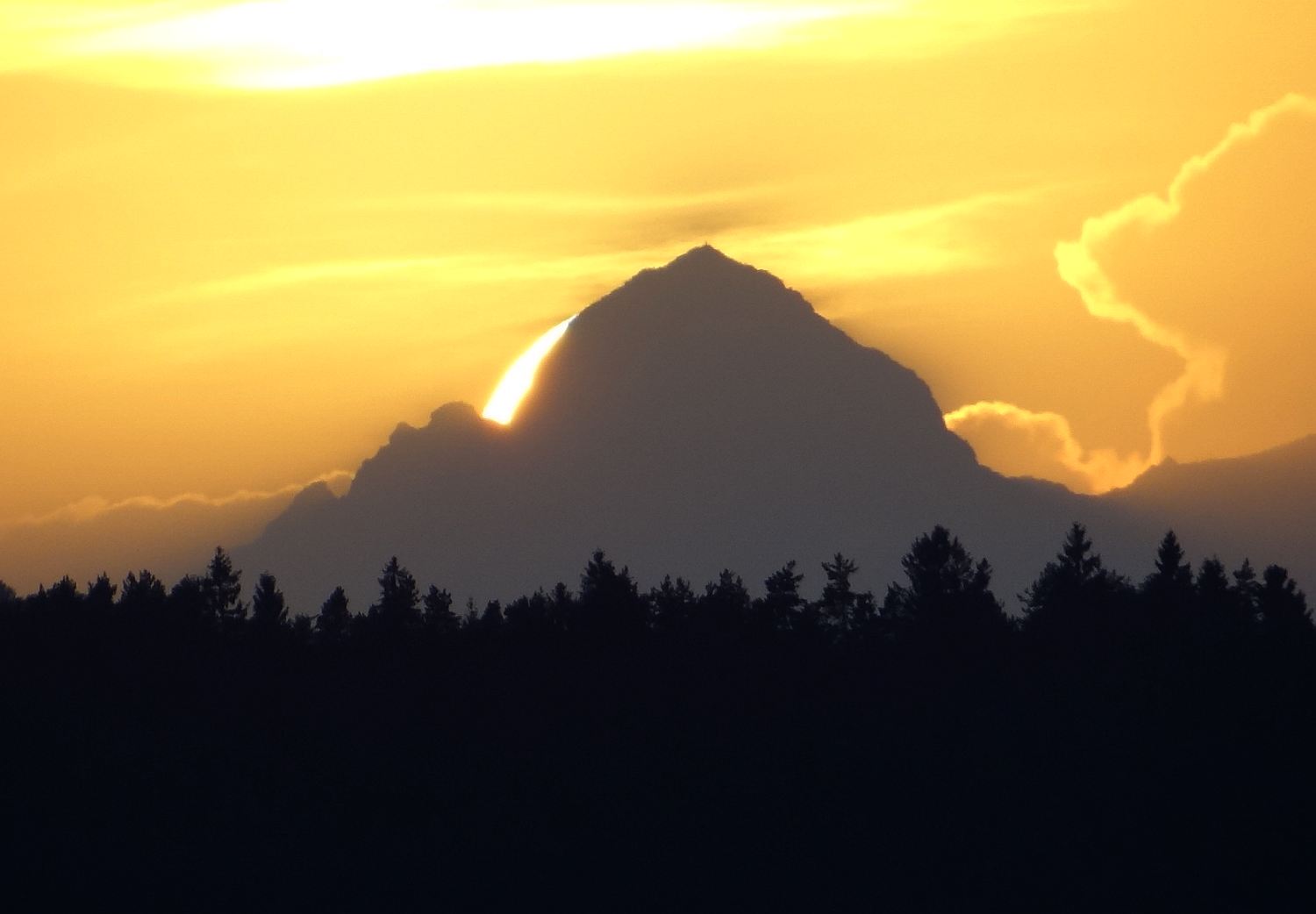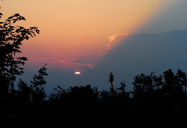 Slika: Zahod Sonca za Triglavom – poletni solsticij - 21. junija 2012, terasa Gimnazije Šentvid. To so prekrasni dogodki, ki iz leta v leto naznanjajo začetek poletja. Na vrhu Triglava brez težav zaznamo Aljažev stolp. Foto: Zorko Vičar.
