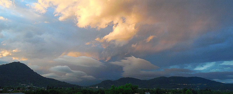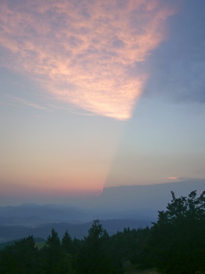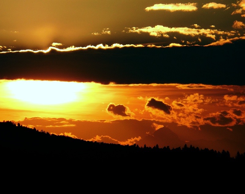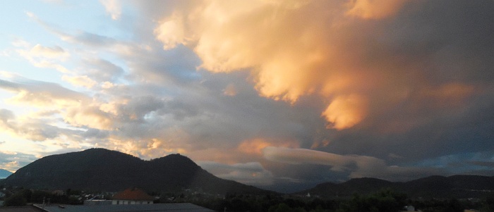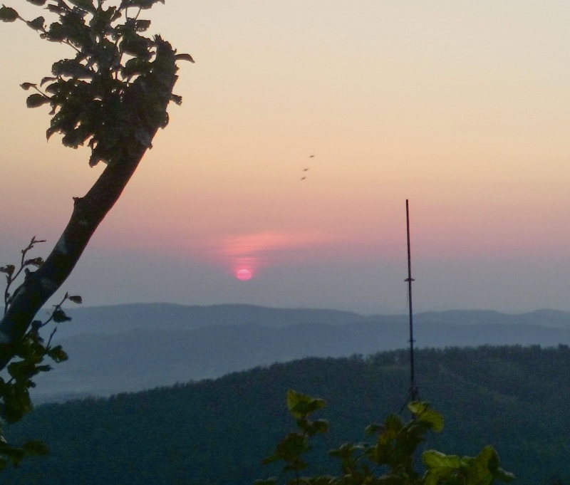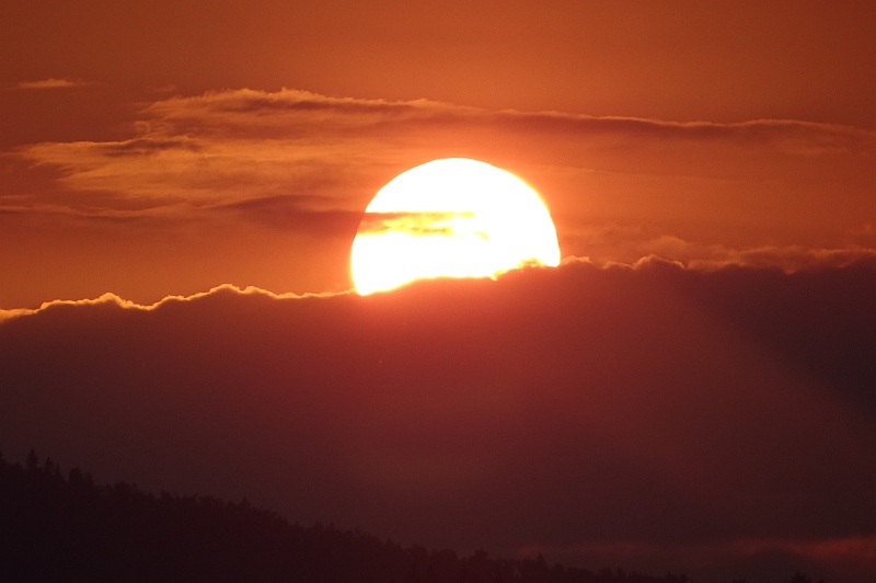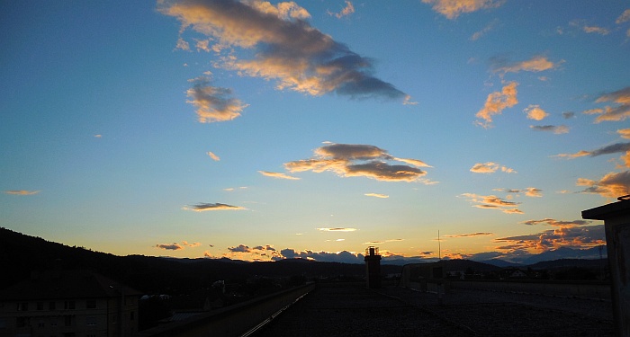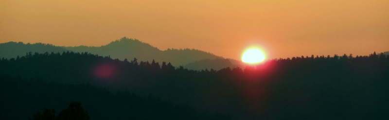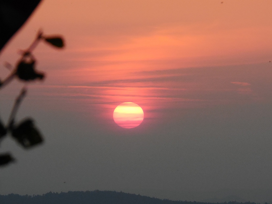 Slika: Zahod Sonca za Triglavom – poletni solsticij - 21. junija 2012, terasa Gimnazije Šentvid. To so prekrasni dogodki, ki iz leta v leto naznanjajo začetek poletja. Na vrhu Triglava brez težav zaznamo Aljažev stolp. Foto: Zorko Vičar.