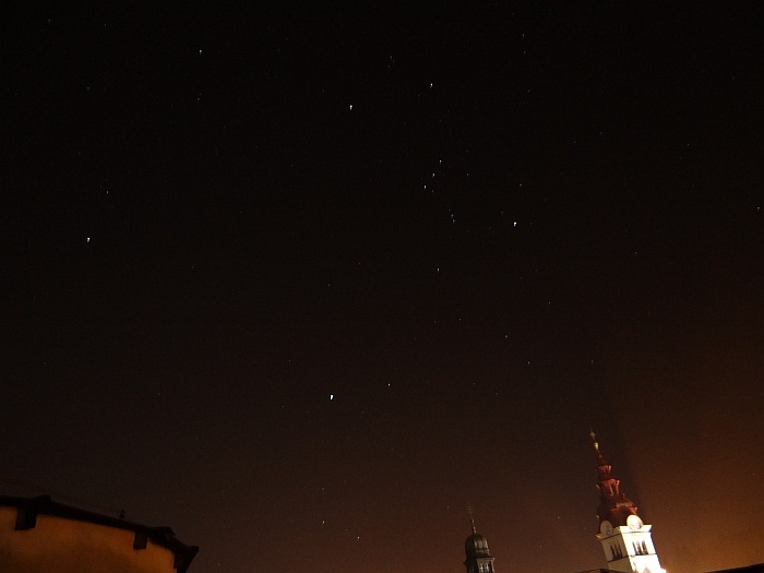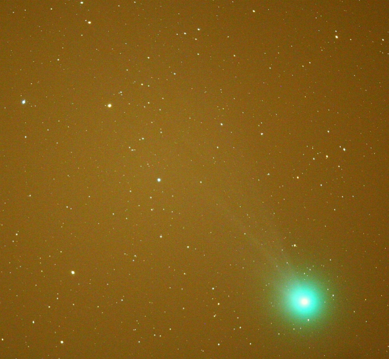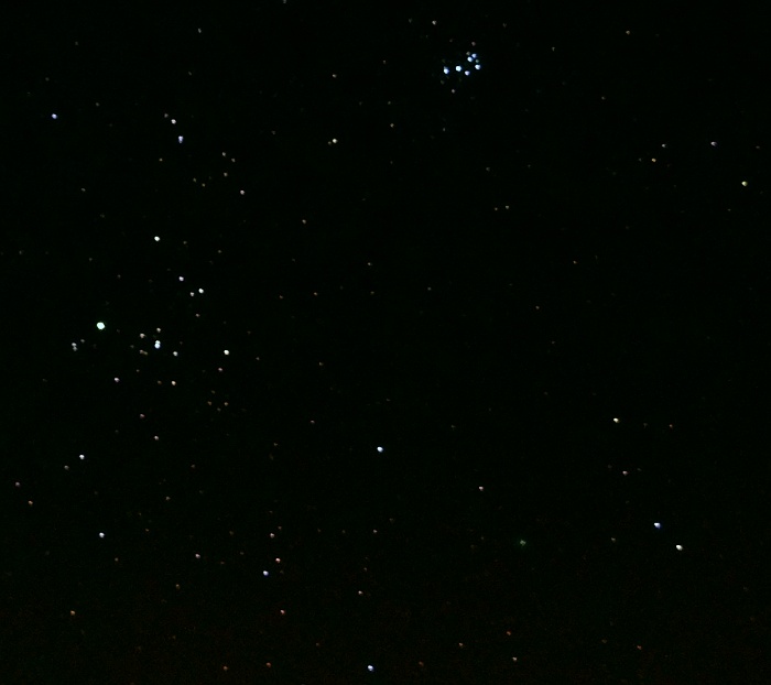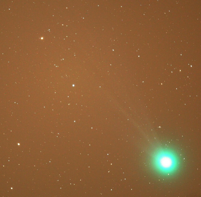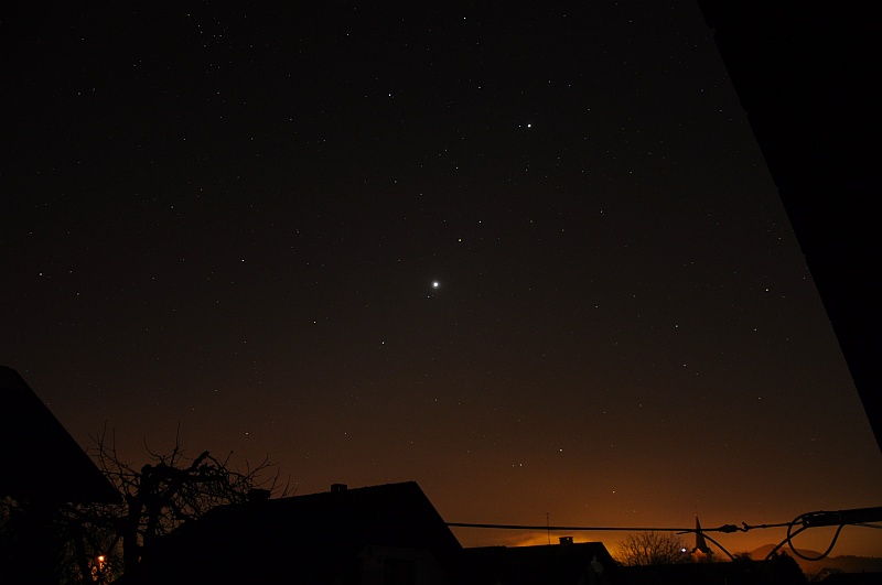 "Zvezda" večera pa bi moral biti komet Lovejoy (C/2014 Q2). In po 21h je dejansko postal. Na Stellariumu sva z Andrejem locirala lego kometa (v Zajcu blizu kroglaste kopice M79) in šla na mraz lovit repatca. Najprej ga je ulovil Andrej v daljnogleu 15x70, nakar sva z laserjem in daljnogledom komet ujela še v Ciki (teleskop Dobson 30 cm, f/5). Torej, kljub legi nad preosvetljeno Ljubljano, smo komet lepo zaznali v daljnogledu. V daljnogledu 20x80 je komet že prav žarel (magnituda 5.5), v Ciki pa se je lepo razločilo svetlo jedro od kome. Rep kometa nam iz Šentvida ni bil usojen.