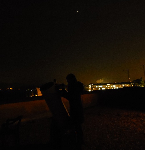 To jesen smo pri astronomskem krožku zgolj 3x opazovali nočno nebo, vsa ostala srčanja je namreč "popestrilo" oblačno nebo, kdaj tudi padavine. A zadnje opazovanje 29. decembra 2014 je bilo vseeno obliž na nepredvidljivo jesen. Dan je bil kristalno jasen in tako smo se skoraj cel dan veselili večernega druženja na terasi šole. A, da se ne bi izneverili tradiciji, se je nebo od 19:30 h pa do 21 h skoraj popolnoma zaprlo. Na naše veliko veselje pa se nas je vreme po 21. uri le usmililo - nebo se je solidno očistilo odvečne koprene (kar po ritmu aladina). Za krožkarje novince smo tako do 19:30 h lahko na hitro preskenirali nebo. Orionova meglica M42 je veličastno žarela, "sestre" v Plejadah (M45) pa so v daljnogledu razkazovale vse svoje čare (daljnogleda SkyMaster 15x70 in 20x80). Prvi krajec Lune pa nas je s svojim reliefom popeljal v Galilejeve občutke iz leta 1609, ko je odkrival nov zelo oddaljen svet posejan z gorami, dolinami, kraterji, puščavami, ...
