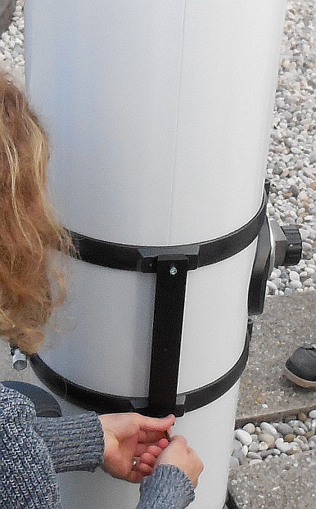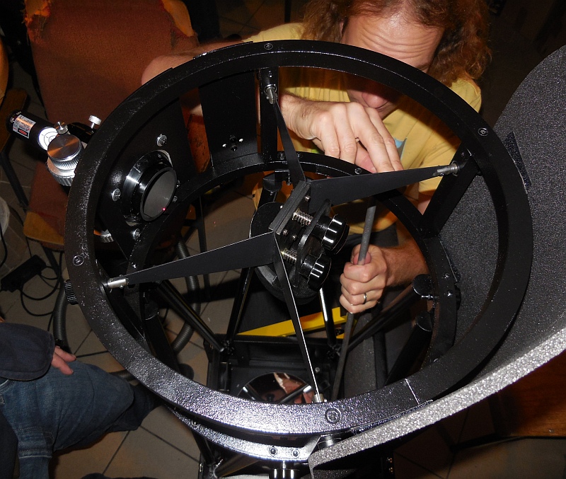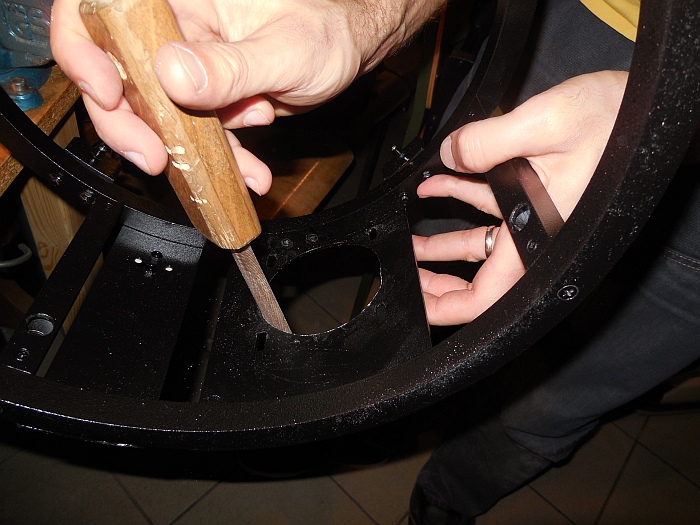 Korekcija novega obroča teleskopa (Andrej s pilo veča odprtino fokuserja) Explore Scientific Ultra Light Dobson, premera 254 mm, 1270 mm gorišča, f/5. Odprtina za fokuser ni imela toliko rezerve, da bi lahko poravnali fokuser in sekundarno zrcalo - čeprav odprtine za vijake imajo možnost vzdolžnega premikanja fokuserja.