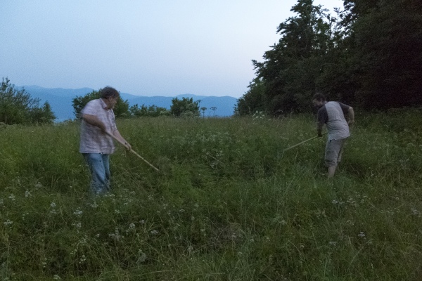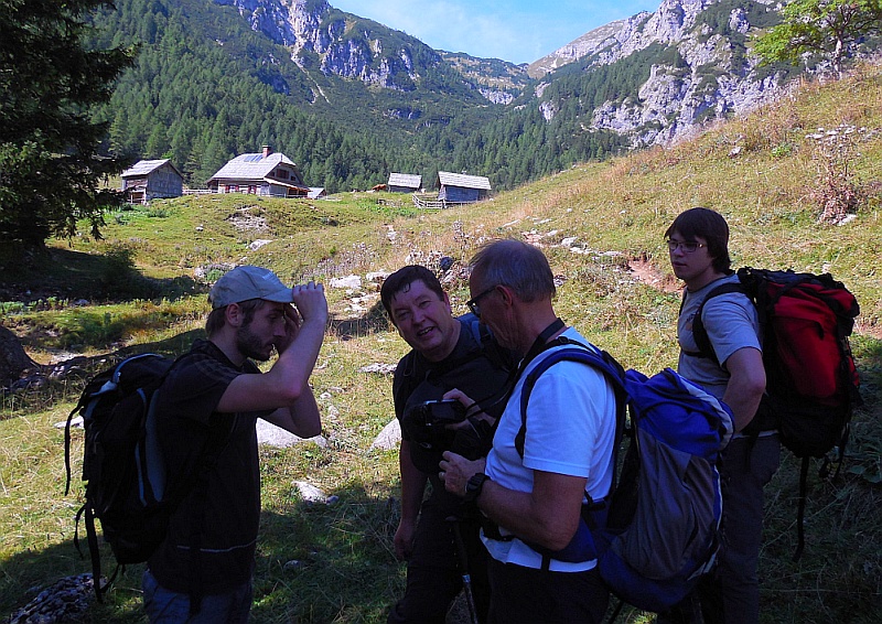 Prvi rahli znaki utrujenosti ob prihodu na romantično planino Konjščica (13:25) - še nismo slutili, kaj nas čaka ... Pred nami se vidi Studorski preval.