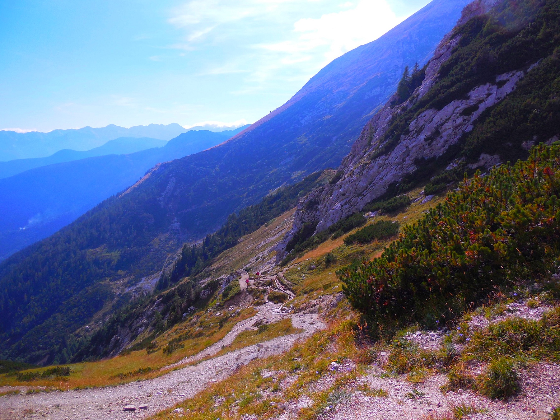 Pogled na Prehodavce (pot do Sedmerih jezer) in v ozadju izstopajoč Krn (smer proti JZ) s spomini na tragiko prve vojne.