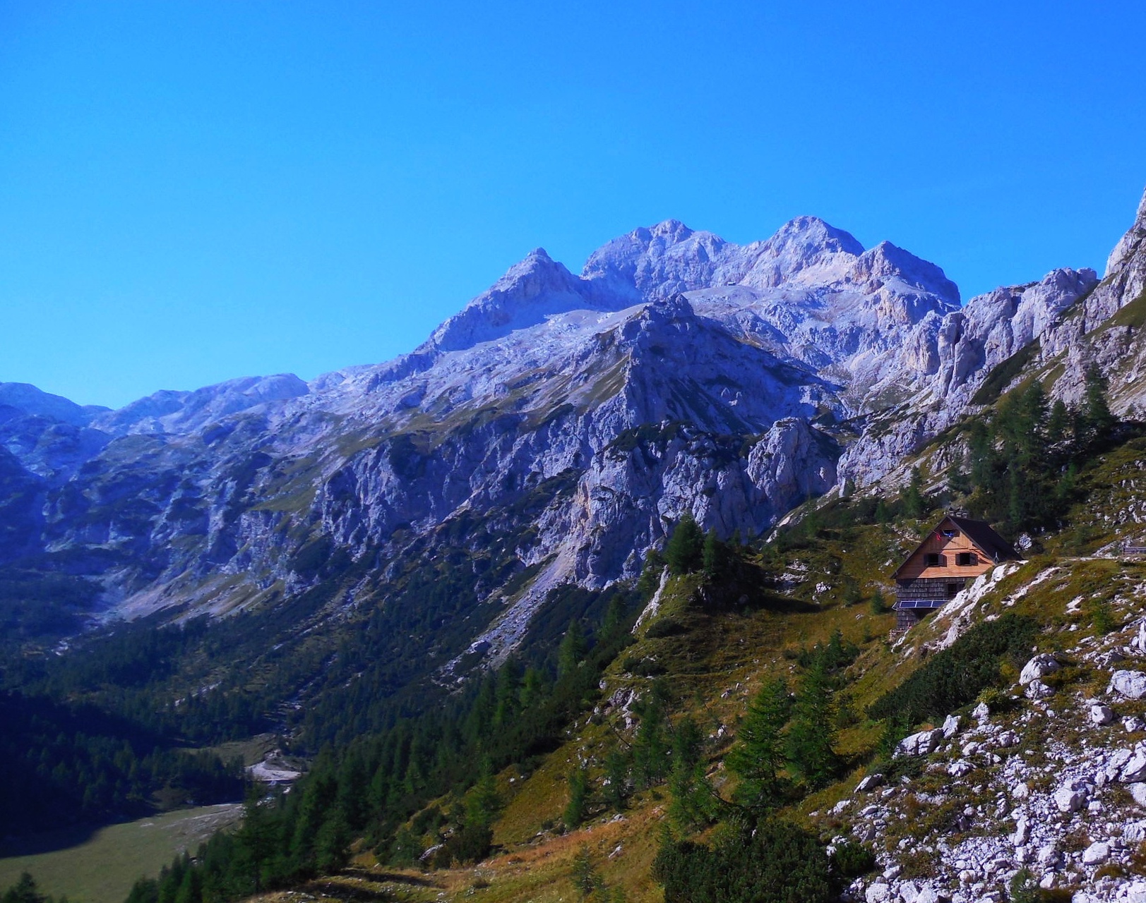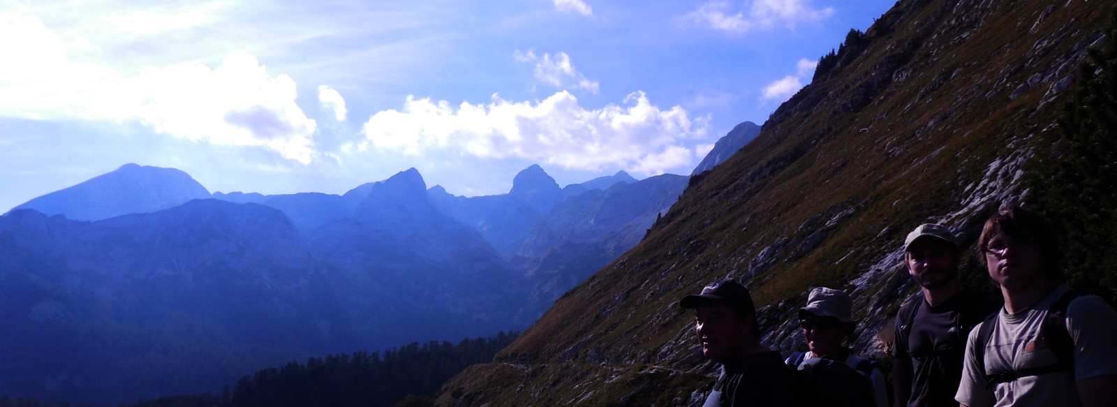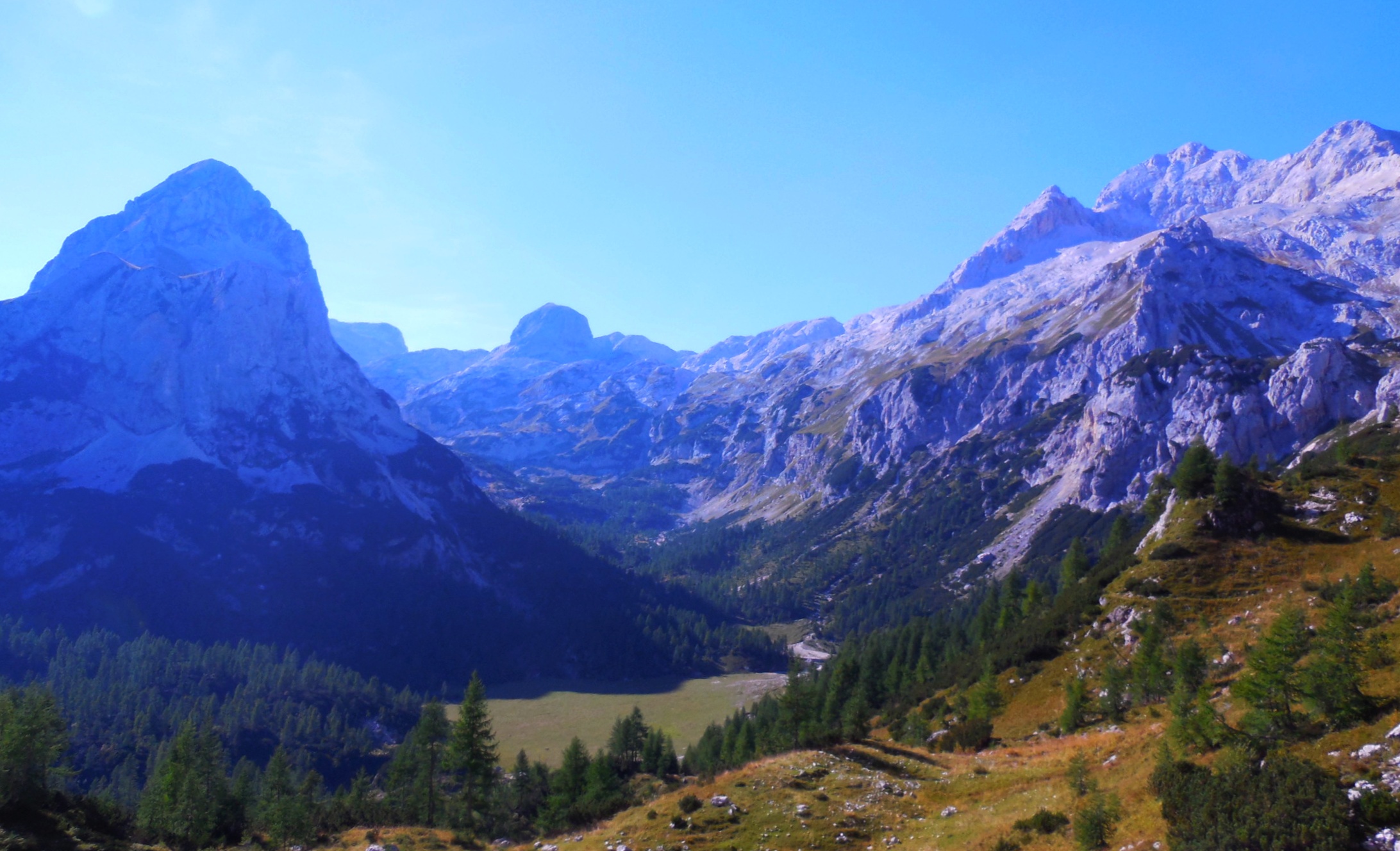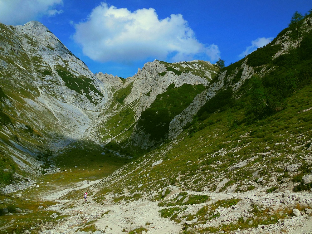 Prelep pogled iz Studorskega prevala (1892m, 15:00) po dobrih dveh urah hoje. Pot nadaljujemo proti Vodnikovemu domu ( Rudno polje in Velo polje).