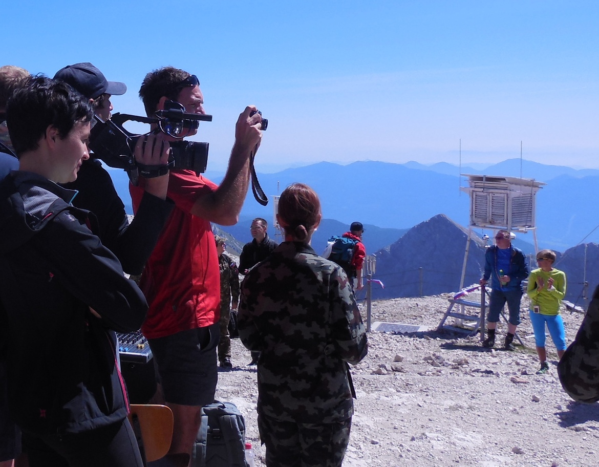 Sodelavci Urada za meteorologijo pred Aljaževim stolpom - 120 let po postavitvi (1895 - 2015).