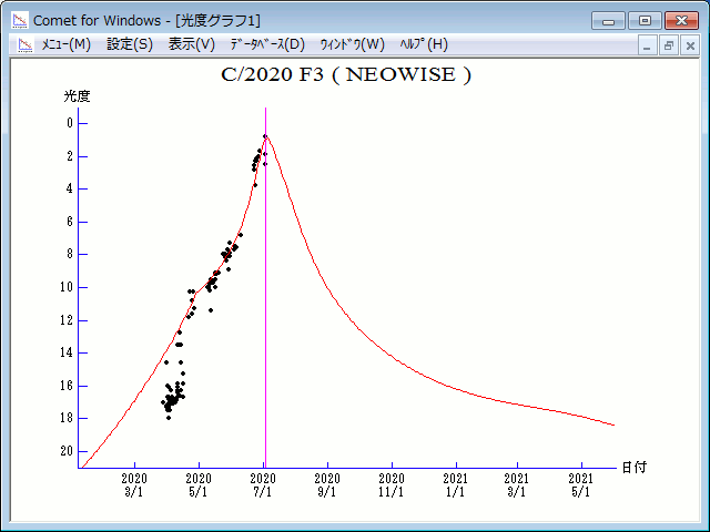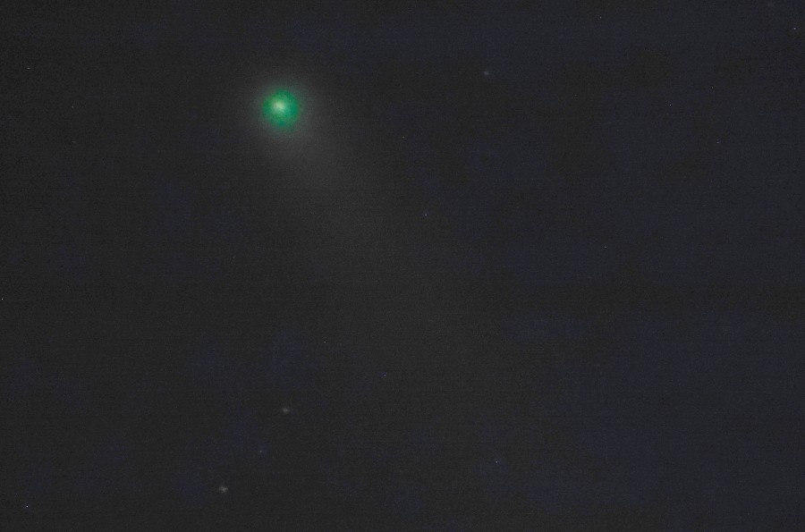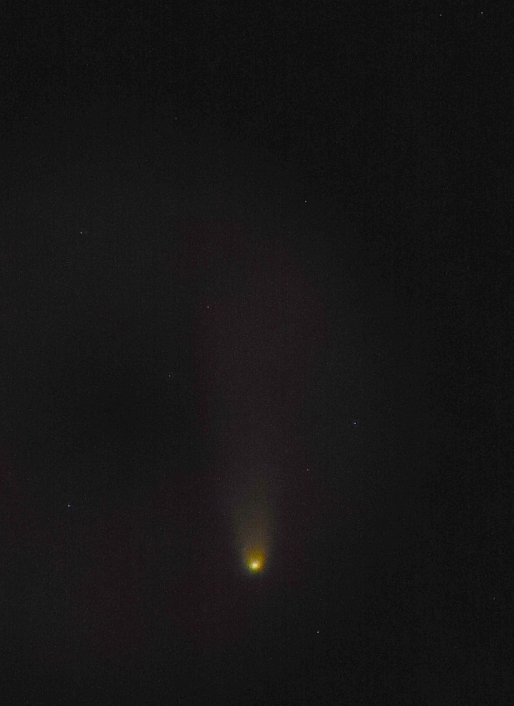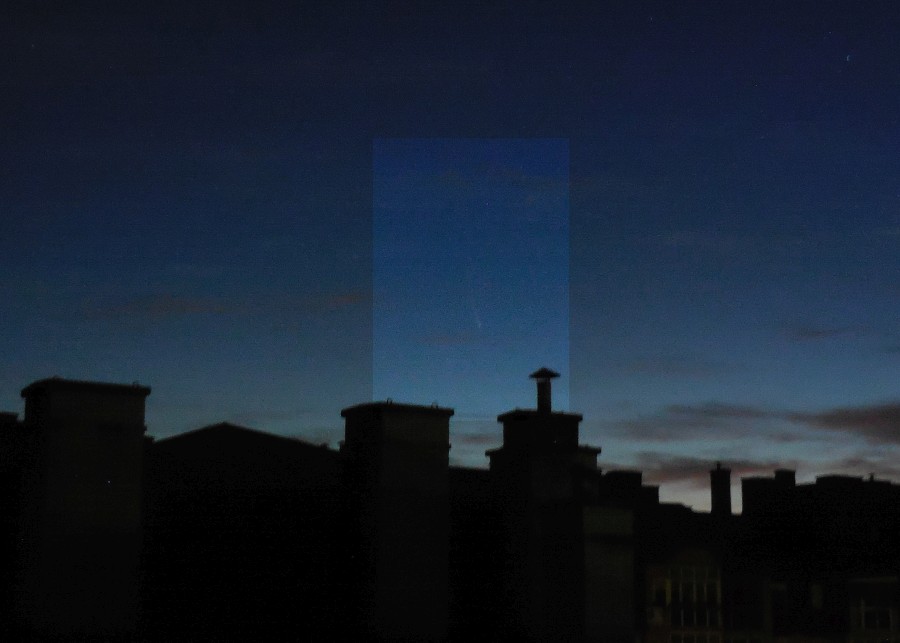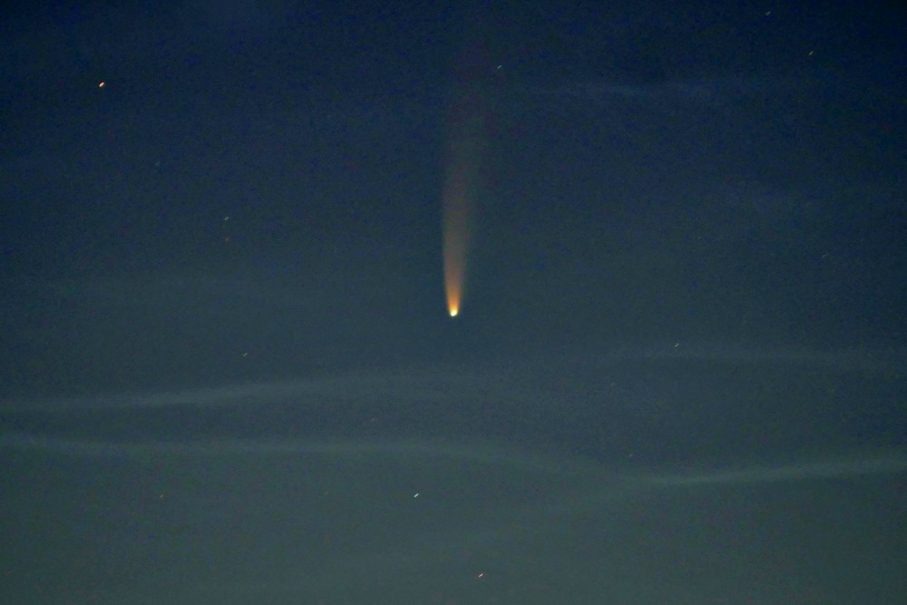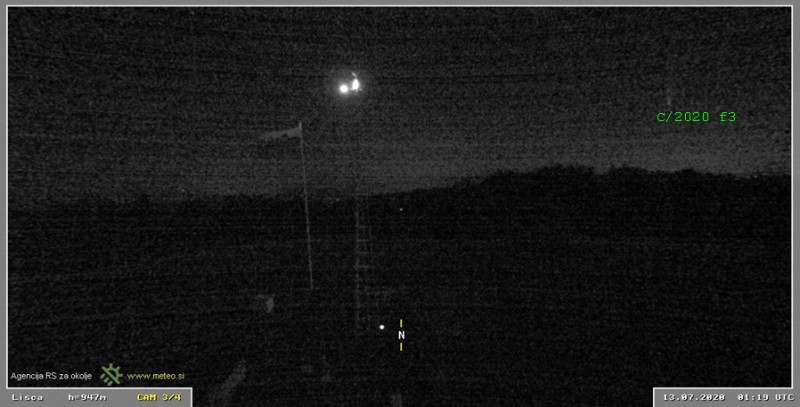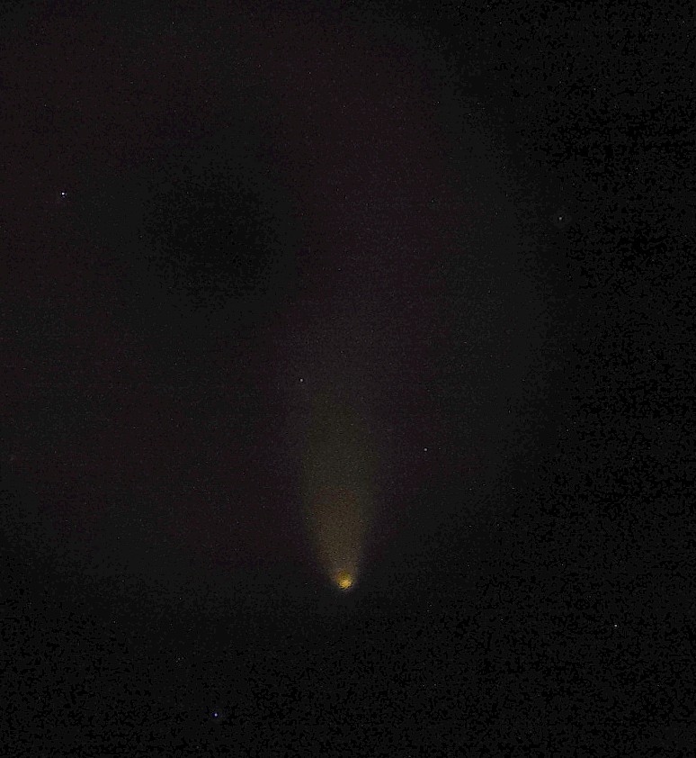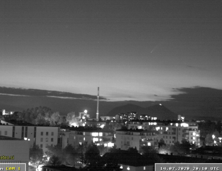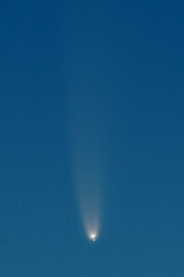 Pojasnilo: Komet NEOWISE (C/2020 F3) potuje po severnem nebu. Njegova razvijajoča se repa se sedaj raztezata pod kotom kakih šestih stopinj preko zgornjega teleskopskega pogleda, ki so ga ob zori 10. julija posneli iz Brna na Češkem. Najlažje je videti širok, rumenkast prašni rep, ki ga navzven poriva tlak sončeve svetlobe. Vendar je na sliki tudi temnejši in bolj modrikast rep, ki ga ne ustvarja odboj svetlobe na kometovem prahu. Ta temnejši rep sestavljajo ioni, ki jih iz kometove kome iztrgajo magnetna polja v sončnem vetru, in fluorescirajo v sončni svetlobi. Na tem ostrem portretu našega novega obiskovalca, ki je k nam prišel iz zunanjih delov Osončja, sta repa podobna nekdanjima svetlima repoma kometa Hale Bopp, ki ga imenujemo tudi Veliki komet leta 1997.