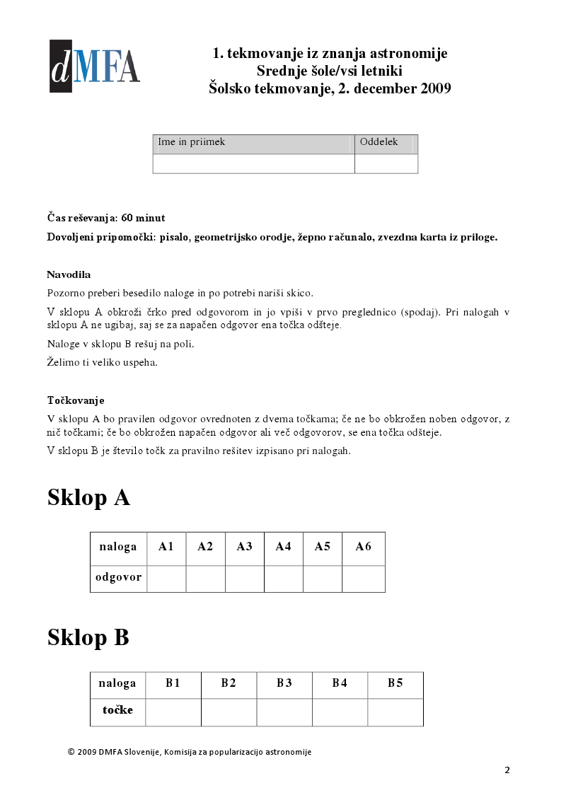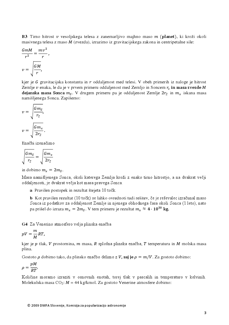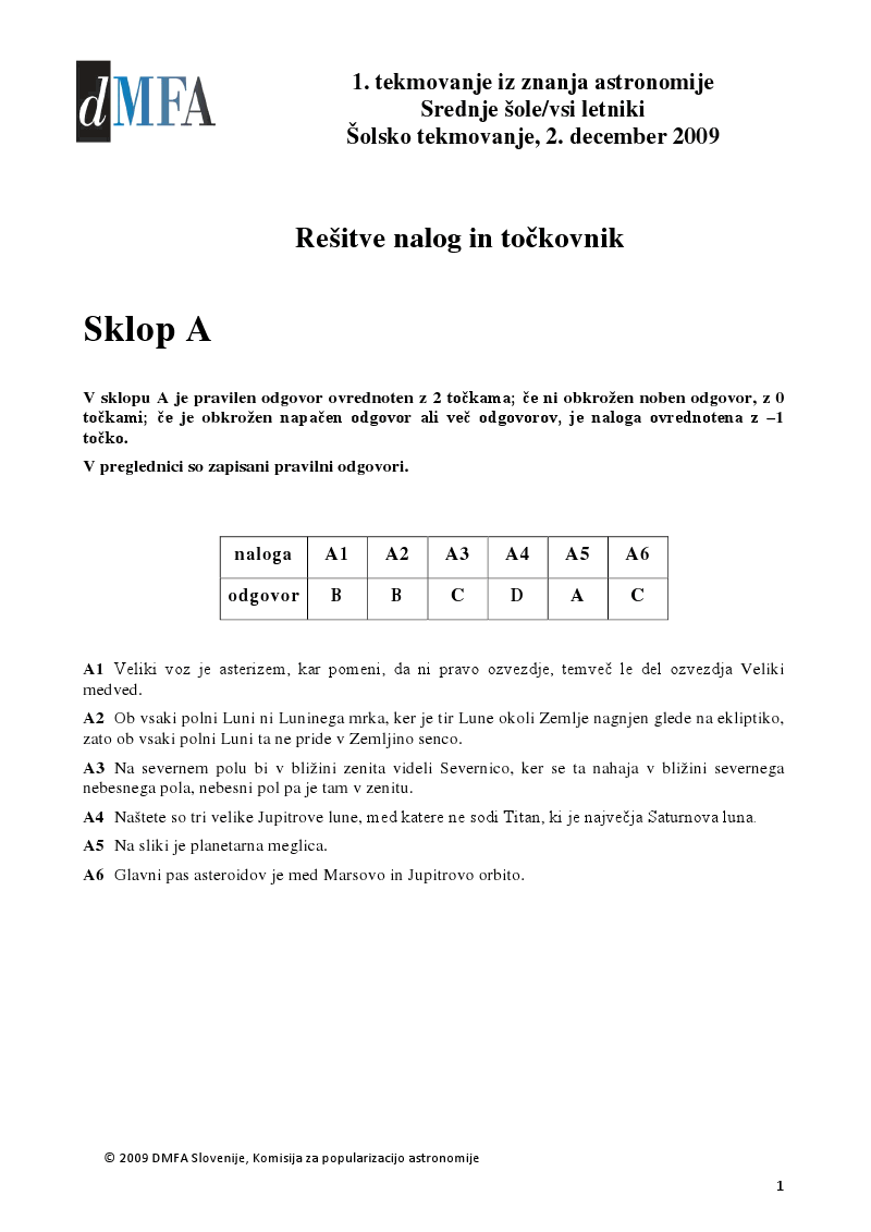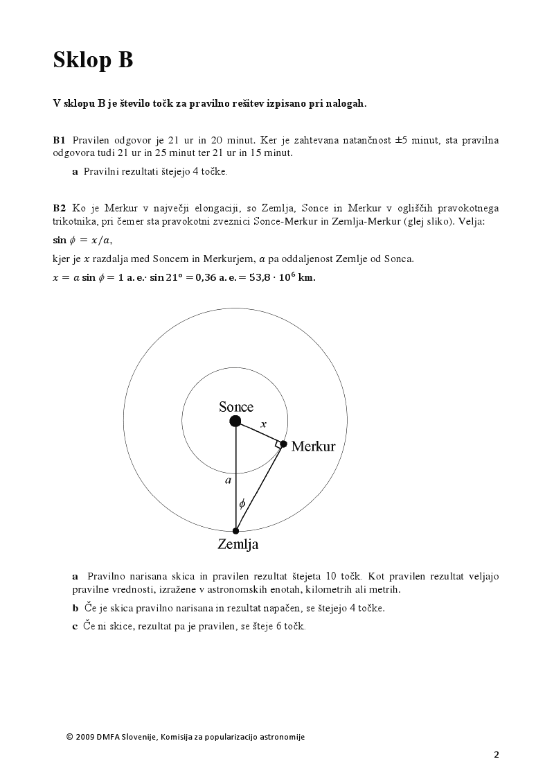 Naloge in rešitve iz astronomije 2009 - šolsko tekmovanje, srednje šole