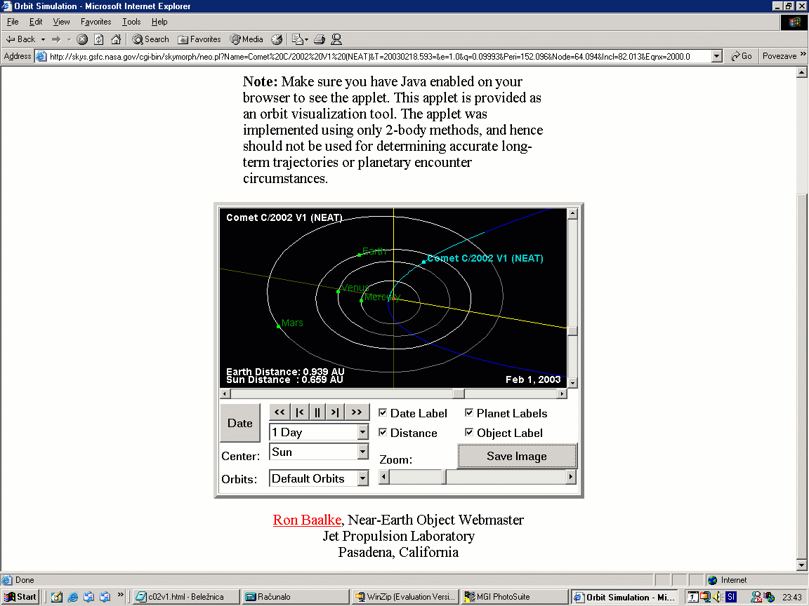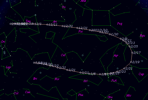 http://cfa-www.harvard.edu/iau/Ephemerides/Comets/2002V1_1.html C/2002 V1 (NEAT) Epoch 2003 Feb. 10.0 TT = JDT 2452680.5 T 2003 Feb. 18.2963 TT MPCM q 0.099269 (2000.0) P Q z +0.000830 Peri. 152.1668 -0.4469110 -0.0894951 +/-0.000015 Node 64.0878 -0.8866014 -0.0882670 e 0.999918 Incl. 81.7208 +0.1191995 -0.9920683 From 1312 observations 2002 Nov. 6-2003 Jan. 31, mean residual 0".6. Date TT R. A. (2000) Decl. Delta r Elong. Phase m1 m2WARNING! This comet gets close to the sun during the period covered in the ephemeris below. Observers are warned to be wary of observing comets near the sun. NEVER point any kind of optical instrument at the sun--instant blindness will be the probable result. 2003 01 31 23 05.57 +07 28.0 0.933 0.679 41.3 73.4 6.2 2003 02 01 23 01.97 +07 13.1 0.936 0.651 39.5 74.3 6.0 2003 02 02 22 58.32 +06 57.1 0.939 0.623 37.7 75.2 5.8 2003 02 03 22 54.58 +06 39.8 0.942 0.595 35.9 76.1 5.6 2003 02 04 22 50.75 +06 21.0 0.944 0.566 34.0 77.0 5.4 2003 02 05 22 46.82 +06 00.4 0.947 0.536 32.1 78.0 5.2 2003 02 06 22 42.76 +05 37.7 0.949 0.506 30.2 79.0 4.9 2003 02 07 22 38.56 +05 12.4 0.951 0.475 28.3 80.0 4.7 2003 02 08 22 34.19 +04 44.0 0.953 0.443 26.3 81.0 4.4 2003 02 09 22 29.64 +04 11.9 0.955 0.410 24.3 82.2 4.0 2003 02 10 22 24.87 +03 35.3 0.957 0.377 22.3 83.3 3.7 2003 02 11 22 19.86 +02 52.9 0.959 0.342 20.2 84.6 3.2 2003 02 12 22 14.57 +02 03.2 0.961 0.307 18.0 85.8 2.8 2003 02 13 22 08.97 +01 03.9 0.963 0.270 15.8 87.2 2.2 2003 02 14 22 03.05 -00 08.4 0.966 0.232 13.6 88.5 1.6 2003 02 15 21 56.85 -01 39.0 0.969 0.194 11.3 89.7 0.8 2003 02 16 21 50.54 -03 36.8 0.974 0.156 9.1 90.5 -0.1 2003 02 17 21 44.84 -06 15.6 0.981 0.121 7.1 89.7 -1.2 2003 02 18 21 41.86 -09 47.5 0.991 0.101 5.8 85.7 -2.0 2003 02 19 21 44.81 -13 46.6 1.002 0.106 6.1 79.4 -1.7 2003 02 20 21 53.15 -17 11.2 1.014 0.134 7.5 75.3 -0.7 2003 02 21 22 04.38 -19 51.3 1.026 0.170 9.4 72.6 0.4 2003 02 22 22 15.97 -21 53.9 1.039 0.209 11.5 70.5 1.3 2003 02 23 22 27.93 -23 28.8 1.053 0.247 13.5 68.6 2.0 2003 02 24 22 39.73 -24 42.9 1.067 0.284 15.3 66.7 2.7 2003 02 25 22 51.23 -25 41.5 1.082 0.321 17.1 64.9 3.2 2003 02 26 23 02.40 -26 27.8 1.099 0.356 18.7 63.1 3.7 2003 02 27 23 13.19 -27 03.9 1.116 0.390 20.2 61.4 4.1 2003 02 28 23 23.59 -27 31.5 1.134 0.423 21.6 59.8 4.5 2003 03 01 23 33.60 -27 52.1 1.152 0.455 23.0 58.2 4.9 2003 03 02 23 43.20 -28 06.6 1.171 0.487 24.2 56.6 5.2 2003 03 03 23 52.41 -28 16.1 1.191 0.517 25.4 55.2 5.5 2003 03 04 00 01.24 -28 21.4 1.212 0.547 26.4 53.7 5.8 2003 03 05 00 09.69 -28 22.9 1.232 0.577 27.4 52.4 6.1 2003 03 06 00 17.79 -28 21.4 1.254 0.606 28.3 51.0 6.3 2003 03 07 00 25.54 -28 17.3 1.275 0.634 29.2 49.8 6.5 2003 03 08 00 32.96 -28 11.0 1.297 0.662 30.0 48.6 6.8 2003 03 09 00 40.07 -28 02.7 1.320 0.689 30.7 47.4 7.0 2003 03 10 00 46.87 -27 52.9 1.342 0.716 31.4 46.3 7.2 2003 03 11 00 53.40 -27 41.8 1.365 0.742 32.0 45.2 7.4 2003 03 12 00 59.66 -27 29.6 1.388 0.768 32.6 44.2 7.6 2003 03 13 01 05.66 -27 16.5 1.411 0.794 33.1 43.2 7.7 2003 03 14 01 11.42 -27 02.7 1.435 0.819 33.6 42.2 7.9 2003 03 15 01 16.96 -26 48.2 1.458 0.844 34.1 41.3 8.1 2003 03 16 01 22.29 -26 33.3 1.482 0.869 34.5 40.4 8.2 2003 03 17 01 27.41 -26 18.1 1.506 0.893 34.8 39.5 8.4 2003 03 18 01 32.34 -26 02.6 1.530 0.917 35.2 38.7 8.5 2003 03 19 01 37.10 -25 46.8 1.554 0.941 35.5 37.9 8.7 2003 03 20 01 41.68 -25 31.0 1.577 0.965 35.8 37.1 8.8 2003 03 21 01 46.11 -25 15.1 1.601 0.988 36.0 36.3 9.0 2003 03 22 01 50.38 -24 59.2 1.625 1.011 36.2 35.6 9.1 2003 03 23 01 54.52 -24 43.3 1.650 1.034 36.4 34.9 9.2 2003 03 24 01 58.52 -24 27.5 1.674 1.056 36.6 34.2 9.4 2003 03 25 02 02.40 -24 11.8 1.698 1.079 36.8 33.6 9.5 2003 03 26 02 06.15 -23 56.3 1.722 1.101 36.9 32.9 9.6 2003 03 27 02 09.80 -23 40.9 1.745 1.123 37.0 32.3 9.7 2003 03 28 02 13.34 -23 25.6 1.769 1.145 37.1 31.7 9.8 2003 03 29 02 16.77 -23 10.6 1.793 1.166 37.2 31.2 9.9 2003 03 30 02 20.11 -22 55.8 1.817 1.188 37.3 30.6 10.0 2003 03 31 02 23.36 -22 41.2 1.841 1.209 37.3 30.1 10.1 2003 04 01 02 26.53 -22 26.8 1.864 1.230 37.3 29.5 10.3 2003 04 02 02 29.61 -22 12.7 1.888 1.251 37.4 29.0 10.4 2003 04 03 02 32.62 -21 58.8 1.912 1.272 37.4 28.5 10.5 2003 04 04 02 35.55 -21 45.1 1.935 1.292 37.4 28.0 10.5 2003 04 05 02 38.41 -21 31.8 1.958 1.313 37.4 27.6 10.6 2003 04 06 02 41.21 -21 18.7 1.981 1.333 37.4 27.1 10.7 2003 04 07 02 43.94 -21 05.8 2.005 1.353 37.4 26.7 10.8 2003 04 08 02 46.61 -20 53.2 2.028 1.373 37.3 26.2 10.9 2003 04 09 02 49.22 -20 40.9 2.050 1.393 37.3 25.8 11.0 2003 04 10 02 51.78 -20 28.8 2.073 1.413 37.2 25.4 11.1 2003 04 11 02 54.28 -20 17.0 2.096 1.432 37.2 25.0 11.2 2003 04 12 02 56.74 -20 05.5 2.118 1.452 37.1 24.6 11.2 2003 04 13 02 59.14 -19 54.2 2.141 1.471 37.1 24.3 11.3 2003 04 14 03 01.50 -19 43.2 2.163 1.490 37.0 23.9 11.4 2003 04 15 03 03.82 -19 32.5 2.185 1.509 37.0 23.6 11.5 2003 04 16 03 06.09 -19 22.0 2.207 1.528 36.9 23.2 11.6 2003 04 17 03 08.32 -19 11.7 2.229 1.547 36.8 22.9 11.6 2003 04 18 03 10.51 -19 01.7 2.251 1.566 36.8 22.6 11.7 2003 04 19 03 12.67 -18 52.0 2.272 1.585 36.7 22.2 11.8 2003 04 20 03 14.79 -18 42.5 2.294 1.603 36.6 21.9 11.9 2003 04 21 03 16.87 -18 33.2 2.315 1.622 36.5 21.6 11.9 2003 04 22 03 18.93 -18 24.2 2.336 1.640 36.5 21.4 12.0 2003 04 23 03 20.94 -18 15.4 2.357 1.659 36.4 21.1 12.1 2003 04 24 03 22.93 -18 06.9 2.378 1.677 36.3 20.8 12.1 2003 04 25 03 24.89 -17 58.6 2.398 1.695 36.2 20.5 12.2 2003 04 26 03 26.82 -17 50.5 2.419 1.713 36.2 20.3 12.3 2003 04 27 03 28.72 -17 42.6 2.439 1.731 36.1 20.0 12.3 2003 04 28 03 30.60 -17 35.0 2.459 1.749 36.1 19.8 12.4 2003 04 29 03 32.45 -17 27.6 2.479 1.766 36.0 19.6 12.4 2003 04 30 03 34.27 -17 20.5 2.499 1.784 35.9 19.3 12.5 2003 05 01 03 36.07 -17 13.5 2.519 1.802 35.9 19.1 12.6 2003 05 02 03 37.85 -17 06.8 2.538 1.819 35.8 18.9 12.6 2003 05 03 03 39.60 -17 00.3 2.557 1.837 35.8 18.7 12.7 2003 05 04 03 41.33 -16 54.0 2.576 1.854 35.7 18.5 12.7 2003 05 05 03 43.04 -16 47.9 2.595 1.871 35.7 18.3 12.8 2003 05 06 03 44.73 -16 42.0 2.614 1.888 