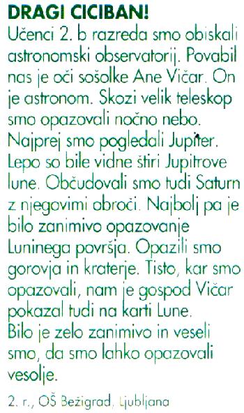 Vtisi otrok ob obisku Astronomskega observatorija Šentvid-Ljubljana (CICIBAN, junij 2001)