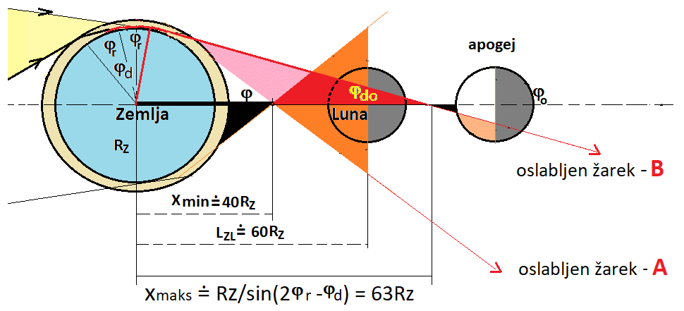 ki nekoliko vpliva na višino stožca Zemljine sence in s tem na dolžino