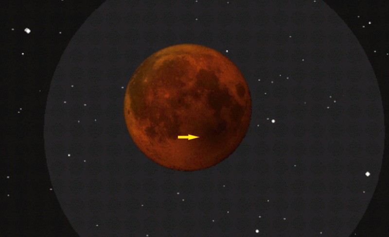 Prav pri zadnjem Luninem mrku je bila Luna blizu apogeja in je potovala praktično čez središče Zemljine Sence. Rahla centralna zatemnitev (»senca na Luni«) je označen z rumeno puščico na spodnji modelski sliki mrka.