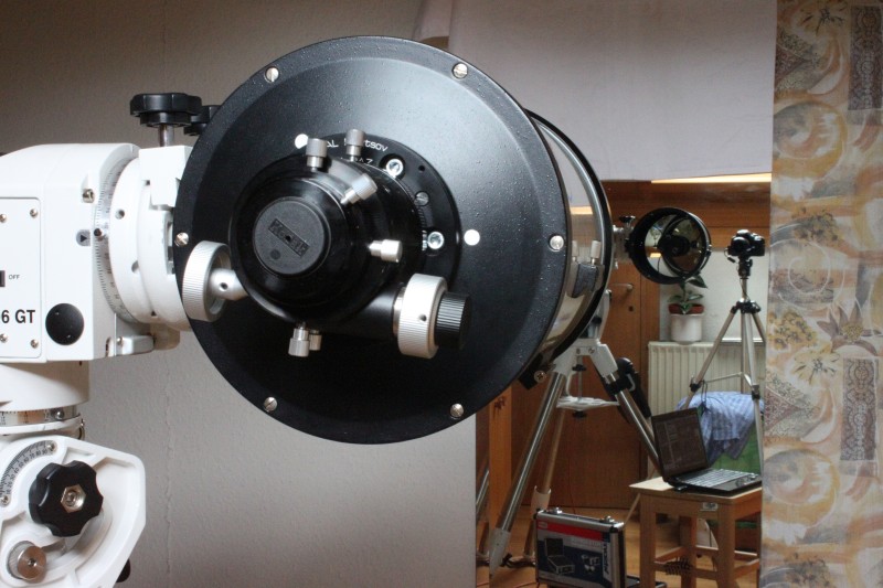 Teleskop sem pritrdil na svojo AZ EQ6 montažo v altazimutni način. V fokuser brez zenitne prizme sem vstavil cheshire kolimator z 2 milimetrsko luknjico. Teleskop sem po nekaj poskusih postavil malo več kot na goriščno razdaljo 1700 mm med ravnim (stenskim) in primarnim zrcalom. Na taki razdalji se namreč skozi cheshire vidi odsev celotne prednje strani teleskopa. Najprej sem teleskop usmeril približno pravokotno na zrcalo (Slika 7). Takrat je cev že v primerni legi, da se tudi skozi cheshire vidi v notranjost teleskopa (Slika 8). Potem sem obračal teleskop, dokler pri pogledu skozi cheshire prednji rob z vijaki v ravnem zrcalu ni koncentričen z vidnim poljem v cheshiru. Pomembno je zagotoviti osvetljenost prednjih delov teleskopa, kar pa ne sme povzročati bleščave v zrcalih. Jaz sem se postavil s strešnim oknom za hrbtom, potem pa sem prekril odseve okna v ravnem zrcalu. Možno je seveda uporabiti tudi umetno razsvetljavo, a meni je bila primernejša dnevna.
