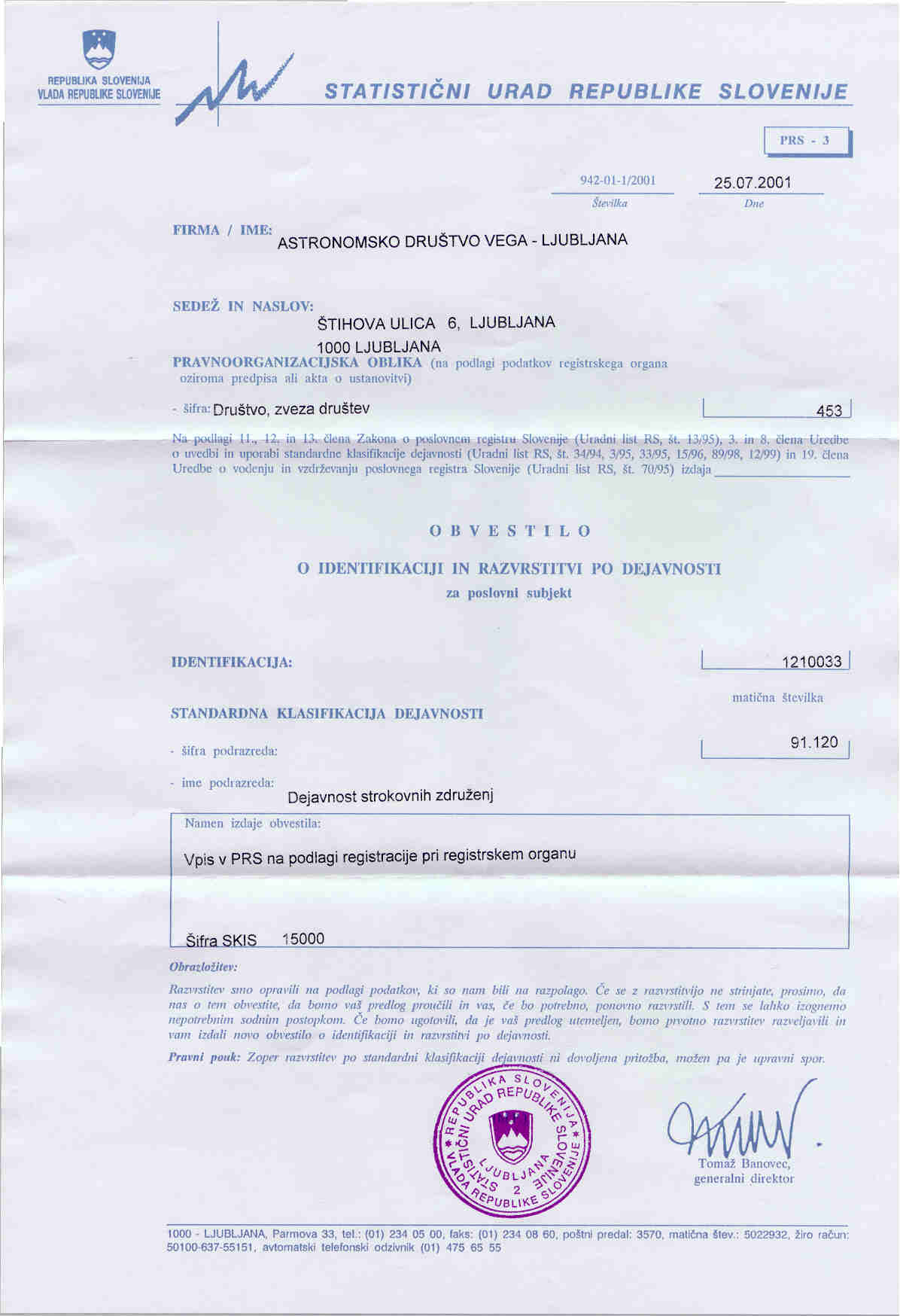 Obvestilo o indentifikaciji in razvrstitvi po dejavnosti