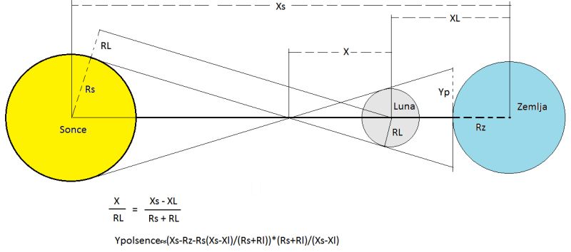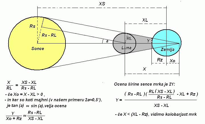 Iz podobnih pravokotnih trikotnikov, in ker so koti majhni, dobimo iz razmerij stranic dokaj preprost rezultat za oceno polmera Lunine sence (Y):