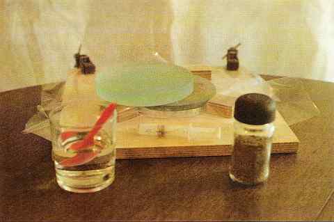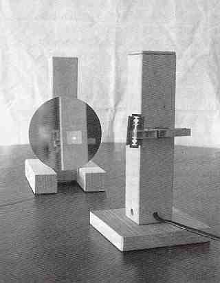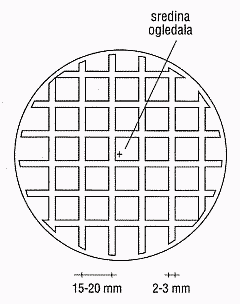 Osnovno pravilo je, da glavno ogledalo vpnemo tako, da ga nikjer nič ne stiska, kar bi ga lahko ukrivilo in popačilo sliko. Ogledalo pritrdimo na okroglo leseno ploščo enakega premera, debelo dvajset milimetrov. Mednju smo v treh točkah podložili koščke mehke gume, na katerih bo ležalo ogledalo. Spojili pa smo ju s tremi pločevinastimi trakovi, širokimi petnajst milimetrov in debelimi en milimeter. Trak je na eni strani pravokotno ukrivljen, tako da ima pet milimetrov širok rob. Dolžina traku je vsota debelin lesene plošče, gume, ogledala in zavitega roba. V našem primeru je to zneslo pet centimetrov. Med ogledalo in pločevinast trak podložimo košček gume in trak privijemo v leseno ploščo.