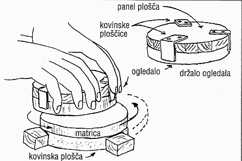 Tudi poliranje bo šlo gladko, saj to že znamo. Matrica je tokrat ravna in ni je težko narediti, saj jo porežemo s kakšnim ravnim nožem ali ravno odrezano pločevino. Vrezali bomo kanale in polirali z zelo kratkimi potezami. Na steklo bomo položili kakšno gumo ali klobučevino, da se nanj ne bo prenašala toplota z roke. Dobro je tudi, da med poliranjem obračamo ogledalo in matrico, tako da je nekaj časa matrica spodaj, nekaj časa pa zgoraj. Vseskozi pa naj bodo poteze čim krajše.