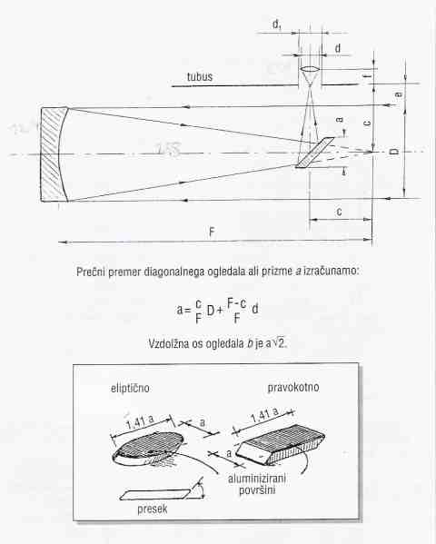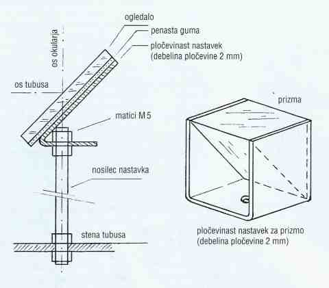 Po pravici povedano smo v radovljiškem krožku marsikaj poenostavili, ker nas je priganjal čas. Menili smo, da je mogoče kakšno stvar tudi kasneje dodelati ali predelati, ne da bi kaj trajno poškodovali. Naša diagonalna ogledala so bila pravokotna. Iz enako široke pločevine smo izdelali nastavek, na katerega smo prilepili tanko, dva do tri milimetre debelo gobo (lahko tudi penasto gumo ali kaj podobno mehkega), na to pa prilepili naše ogledalo. Odpasti ne more, zvija pa ga tudi ne nobena sila. Nastavek smo s šest milimetrskim vijakom pritrdili na tubus nasproti odprtine okularja. Nekaj podobnega naredimo s prizmo, le da pločevinasti nastavek izdelamo tako, da objame prizmo s strani. Tako je lažje počakati, da se nas usmili kakšen dober ključavničar, ki je voljan izdelati boljši nosilec.