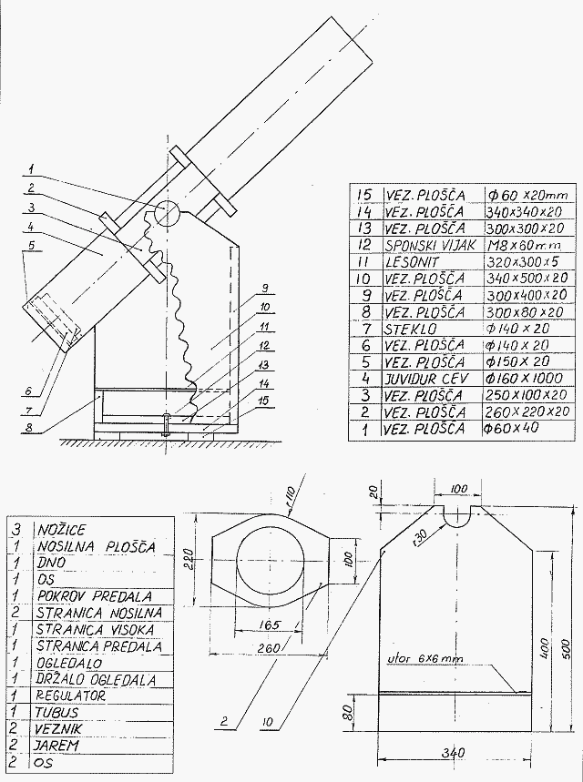 Za prvo silo vam nudimo preprost načrt za izdelavo tubusa in stojala tipa Dobson, kakršnega smo izdelali pri našem krožku. Vsi deli so iz vezane ali iverne plošče, debele dvajset milimetrov, le cev (tubus) je iz juvidur cevi za odtoke. Posebej je narisan jarem in nosilna stranica, vsi drugi deli so kvadratni, pravokotni ali okrogli. Med seboj so spojeni z lesnimi vijaki, dolgimi štiri centimetre in zlepljeni z mizarskim lepilom. Med odprtino jarma in cev prilepimo dva in pol milimetra debel trak klobučevine, da se nam cev, če je pobarvana, ne bi odrgnila. Med nosilno ploščo in dno nalepimo kakšno plastiko ali le koščke, da se bosta lahko med seboj dobro vrteli.