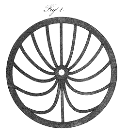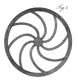If the spokes, instead of being straight, be already curved, like those of the Persian water-wheel, their form, when viewed through bars, will undergo modifications, which may readily be traced by applying to them the same theory. Thus, by giving a certain curvature to the spokes, as in fig. 5, they will at one part of their revolution appear straight, namely, where the optical deception operates in a direction contrary to the curvature.