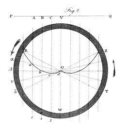 In order to trace more distinctly the operation of this principle in the present case, it will be best to take the phenomenon in its simplest form, as resulting from the view of a single radius, (fig. 2.) OR of the wheel VW, revolving steadily upon its axis, but without any progressive motion, and seen through a single narrow vertical aperture which is moving horizontally in a given direction PQ. Let us also assume that the progressive motion of the aperture is just equal to the rotatory motion of the circumference of the wheel. It is obvious that if, at the time of the transit of the aperture, the radius should happen to occupy either of the vertical positions VO or OW, the whole of it would be seen at once through the aperture, in its natural position; but if, while descending in the direction VR, it should happen to be in an oblique position RO, terminating at any point of the circumference at the moment the aperture has, in its progress horizontally, also arrived at the same point R, the extremity of the radius will now first come into view, while all the remaining part of it is hid. By continuing to trace the parts of the radius that are successively seen by the combined motions of the aperture and of the radius, we shall find that they occupy a curve Rabcd generated by the continued intersection of these two lines. Thus, when the aperture has moved to A. the radius will be in the position O-alpha; when the former is at B, the latter will be at 0-beta, and so on.