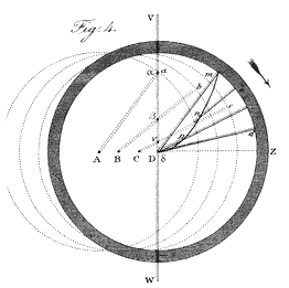 Since the curved appearance of the lines results from the combination of a rotatory, with a progressive motion of the spokes, in relation to the apertures through which they are viewed, it is evident that the same phenomena must be produced if the bars be at rest, and both kinds of motion be united in the wheel itself. For, whether the bars move horizontally with respect to the wheel, or the wheel with respect to the bars, the relative motion between them, and its effects, in as far as concerns the appearance in question, must be the same. The attention of the spectator should in both cases be wholly directed to the wheel, so that the motions in question should be referred altogether to it. Thus, in fig. 4, the real positions, at successive intervals of time, of the spoke Aa, when the wheel is rolling on the ground in the direction AZ, are expressed by the lines Aa, Bb, Cc and Dd. While the spoke is in these positions, the portions of it really seen through the fixed aperture VW, are the parts , alpha, beta, gamma, delta, the impressions of which, being retained upon the retina, and referred to the wheel when in its last position, form the series of points m, n, p and q, in the curved spectrum m D.