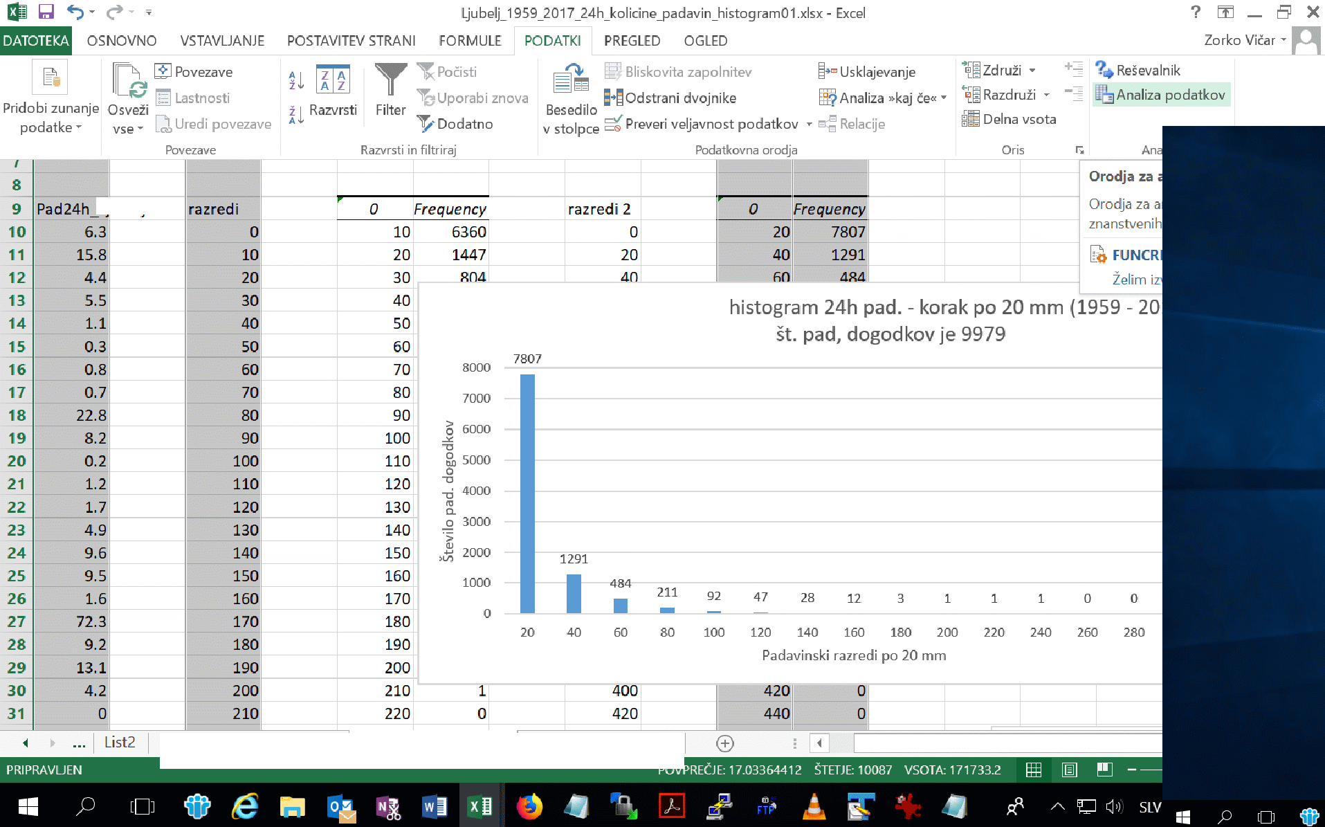 Kopirate podatke (rec. dnevne padavine za x let) v kolono, v drugi koloni določiš razpon (razrede, rec po 20 mm),