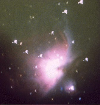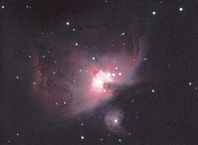 posneta v gorišču teleskopa MEADE LX200, D=25,4 cm, f/6.3. Datum: januar 1998; čas: 30 min. Meglica je oddaljena 1800 sv.l. in je ena najsvetlejših in najlepših meglic nasploh. Vidna je s prostim očesom v Meču Oriona. V njenem središču so sateliti odkrili veliko infrardečih virov, kar je dokaz, da se v njej rojevajo zvezde. Desno spodaj (ob meglici M42) je meglica M43. Posnel Rok Starič. Rok je imel sicer jasno noč, a precej vetrovno, kar se pozna na posnetku, saj so občasni sunki vetra majali tubus teleskopa.