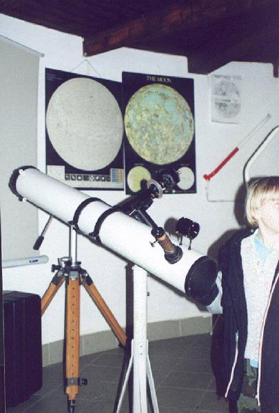 Vendar smo končno le preslišali te "strokovne" nasvete in opazovali velikanko Luno (na žalost polno in nas ni očarala) in hkrati teleskop (z malo upanja oz. veliko skepse) usmerili še v neko zelo svetlo piko na jugovzhodnem delu neba. Teleskop ni imel iskala in prvič sploh nismo pomislili, da bi polarno os usmerili proti Severnici (za zemeljske mirujoče objekte je bilo to nepomembno). Najboljši "namerilec" cevi brez iskala je bil Žiga Budja, ki je tudi odlično zaznaval podrobnosti. Glej ga zlodja, v okularju smo zagledali kar velik krogec (to ni bila zgolj svetleča pika, ni bila zvezda), zraven pa smo opazili tudi neke pikice "zvezdice", ki so nas presenetile, ker so bile poravnane v vrsti. Kaj je zdaj to? Človek ob takih trenutkih potegne iz spomina vse živo in nekako se nam je svitalo, da smo že nekje slišali o planetu Jupitru in njegovih lunah. Kako preveriti in se prepričati kaj smo videli, o imenu ozvezdja se nam še sanjalo ni? V reviji Proteus so bile nekje na koncu tudi informacije o večernem nebu. Tam je pisalo, da se na večernem nebu, na jugovzhodu v ozvezdju Leva nahaja Jupiter. To je bil res velik trenutek za nas. Torej se tudi iz mesta da opazovati nebesna telesa. Poiskali smo karto neba, se naučili primerjati karto z nebom (ozvezdja Leva nam ni bilo težko prepoznati), opazovali smo torej največji planet našega osončja, Jupiter, z Galilejevimi lunami. Delo je sedaj teklo veliko bolj optimistično in praktično. Takoj smo "pogruntali", da je polarno os potrebno usmeriti proti severu, da potem samo z vijakom na ekvatorskem obroču enostavno sledimo navideznemu vrtenju neba. Izjemen optik iz Savelj, gospod Marjan (in gospa Albina) Tratnik nam je podaril nekaj leč, ki jih je oče Marka Giacomellija kvalitetno vgradil v iskalo. V iskalu smo naredili nitni križ v ravnini gorišča okularja kar iz tanke žice. Sedaj smo hitreje in enostavneje iskali. Še nekaj besed o teleskopu. Teleskop je najbrž kupila šola, ko je astronomijo na Šentvidu še vodil znameniti praktik, geograf, naravoslovec Pavel Kunaver (najbrž okrog leta 1960, ali sredi 50-ih let 20. stoletja). Prvotno je bil to refraktor, a so ga "nadarjeni" dijaki po njegovem odhodu (to je kar navada po slovenskih šolah) dodobra obdelali, oskubli. Mislim pa, da ga je šola dala v obnovo v osemdesetih letih (krožek je takrat vodil prof. Niko Kastelic). V zameno za preostalo optiko in doplačilo so nanj pritrdili Newtonovo cev, ostalo optiko, ki je pa spet doživela posege "ustvarjalnih" dijakov.