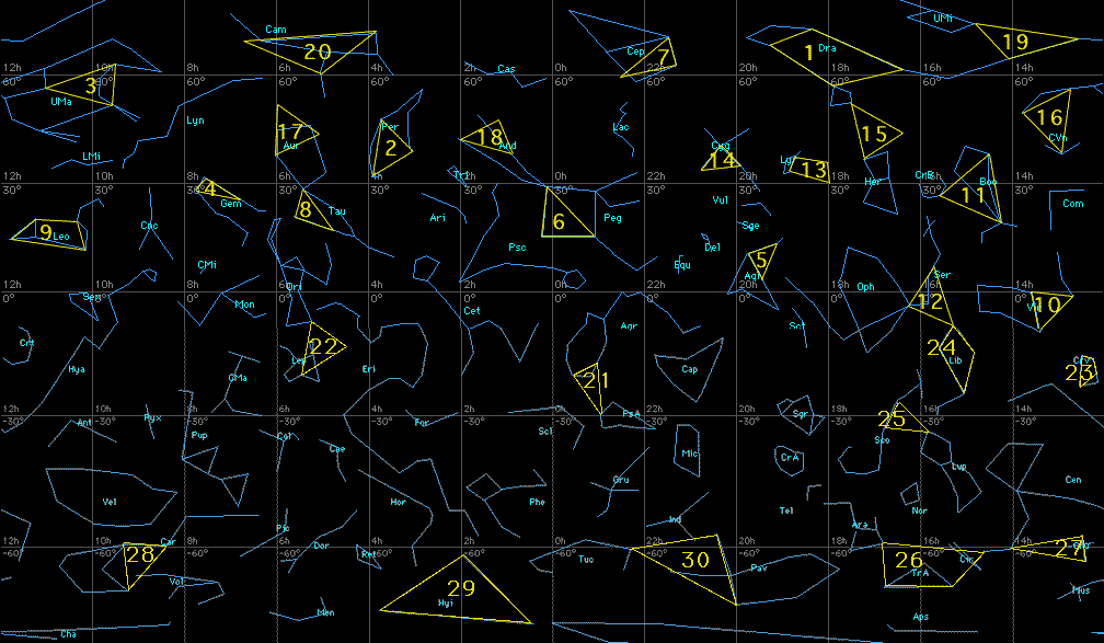 Area Corner stars Constellation 1 Chi-Zeta-Delta-Xi Dra Draco 2 Beta-Delta-Zeta Per Perseus 3 23-Theta-Beta UMa Ursa Major 4 Alpha-Epsilon-Beta Gem Gemini 5 Zeta-Gamma-Delta Aql Aquila 6 Alpha And--Gamma-Alpha Peg Pegasus-Andromeda 7 Alpha-Beta-Delta Cep Cepheus 8 Alpha-Beta-Zeta Tau Taurus 9 Alpha-Beta-Gamma-Delta Leo Leo 10 Alpha-Zeta-Gamma Vir Virgo 11 Alpha CrB--Gamma-Alpha Boo Corona Borealis-Bootes 12 Alpha Ser--Beta Lib--Delta Oph Serpens-Libra-Ophiuchus 13 Beta-Zeta Lyr--Theta-Nu Her Lyra-Hercules 14 Epsilon-Eta-Gamma Cyg Cygnus 15 Beta Dra--Tau-Pi Her Draco-Hercules 16 Alpha CVn--Epsilon-Eta UMa Canes Venatici-Ursa Major 17 Epsilon-Theta-Delta Aur Auriga 18 Mu-Gamma-Phi And Andromeda 19 Kappa-Alpha Dra--Beta UMi Draco-Ursa Minor 20 42-Beta-Gamma Cam Camelopardalis 21 Alpha PsA--98-Delta Aqr Pisces Austrinus-Aquarius 22 Beta Lep--Beta Ori--53 Eri Lepus-Orion-Eridanus 23 Delta-Gamma-Epsilon-Beta Crv Corvus 24 Beta-Gamma-Sigma-Alpha Lib Libra 25 Alpha-Epsilon Sco--Chi Lup Scorpius-Lupus 26 Gamma-Alpha TrA--Eta Ara--Alpha Cen Triangulum Astrinus-Ara-Centaurus 27 Beta Cen-Alpha-Gamma Cru Centaurus-Crux 28 Beta-Epsilon-Iota Car Carina 29 Gamma-Alpha-Beta Hyd Hydrus 30 Alpha Tuc--Alpha-Epsilon Pav Tucana-Pavo