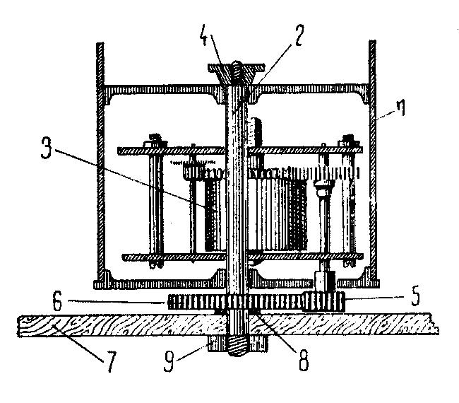 Gibanje se prenaša z urnega mehanizma na valj na naslednji način (sl. 5): urni mehanizem obrača zobnik - okretač (5), ki se vrti po obodu večjega, mirujočega zobnika (6), ki je z osjo (2) pritrjen na podstavek (7).