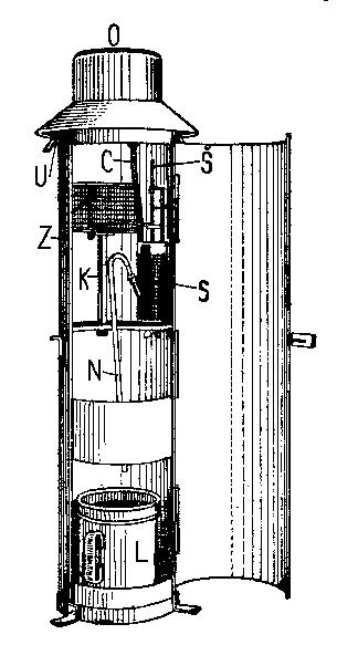 Posoda je dolga 60 cm. Na spodnji strani je trdno zaprta s pokrovom (2), katerega lahko snamemo. Na zgornji strani posode je pritrjen obroč (3) z ostrim prostim robom, ki oklepa površino 50 cm2 . Na posodo je nasajen premičen obroč (4) z ročajem za obešanje (5). Na zunanji strani posode je vrezana skala v centimetrih, pri kateri se 0 ujema z ostrim robom obroča.