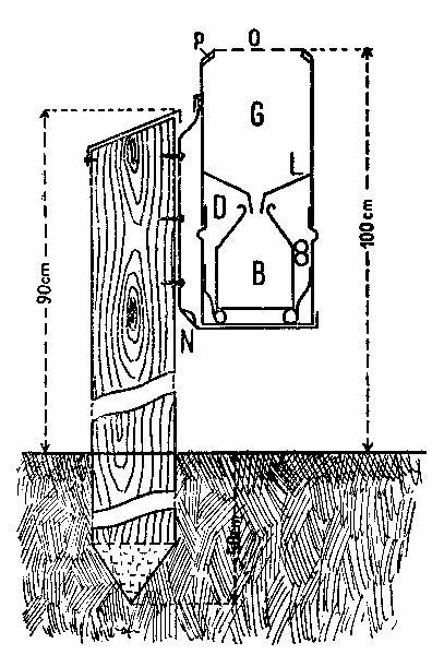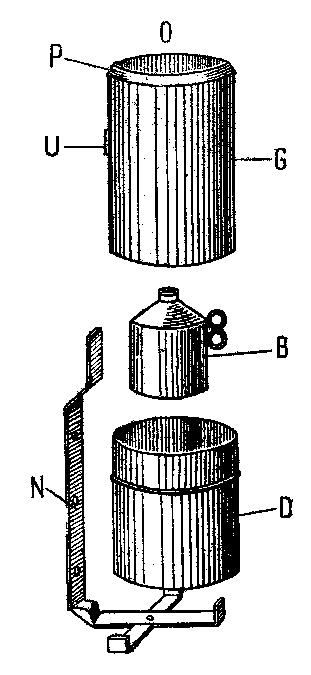 Zgornja posoda (G) ima na zgornji strani odprtino (O), v kat3ero padajo padavine. Odprtina je obdana z medeninastim obročem (P), ki ima oster rob. Premer odprtine (O) je 159,6 mm, površina pa 200 cm2. Na notranji strani je pri dnu pritrjen lijak (L), skozi katerega teče voda od padavin v kanglico (B). Dna zunanji strani zgornje posode se nahaja nastevek (U), ki ga pri nameščanju zgornje posode nasadimo na nosilec (N). Zgornja posoda pride preko spodnje. Spodnja posoda (D) ima ravno dno s prtrjenim ležiščem, na katerem stoji kanglica (B). Ležišče drži kanglico točno v sredini posode, tako da konec lijaka nemoteno vstopa v vrat kanglice. Na ta način je kanglica ločena od sten posode, da se ob sončnem vremenu voda v njej ne bi preveč segrela in bi manj izhlapela. Železni nosilec (N) ima obliko vodoravnega križa, na katerem stoji dno ombrometra. En krak križa je daljši in je zavit navzgor pod kotom 90o. Ta konec je s tremi vijaki pritrjen na lesen kol. Na zgornji konec nosilca, ki je malo ukrivljen, nasadimo nastavek zgornjega dela posode. |