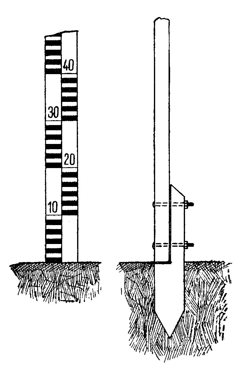Letev postavimo na lesen, v zemlji zabit kol, dolg 60 cm, s presekom 6 cm x 6 cm. Zgornji del kola je za debelino letve izdolbljen v dolžini 24 cm (sl. 99 b). Na ta izrezani del postavimo letev in jo z dvema vijakoma pritrdimo na kol, ki ga zabijemo 36 cm globoko v zemljo, tako da je spodnji rob letve (00 cm) v višini površine tal. Ko snegomer pritrdimo, mora stati navpično in biti obrnjen s skalo proti severu.