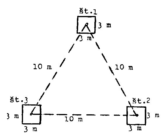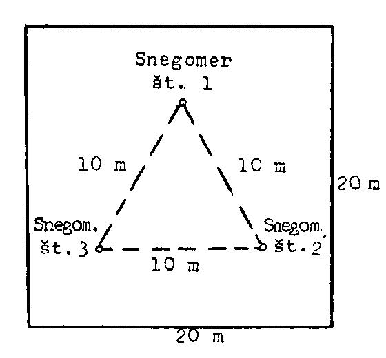 Na tako izbranem prostoru postavimo tri stalne snegomere, približno v vogalih enakostraničnega trikotnika. Razdalja med njimi mora biti najmanj 10 m. Snegomere oštevilčimo s številkami od 1 do 3 (sl. 97).